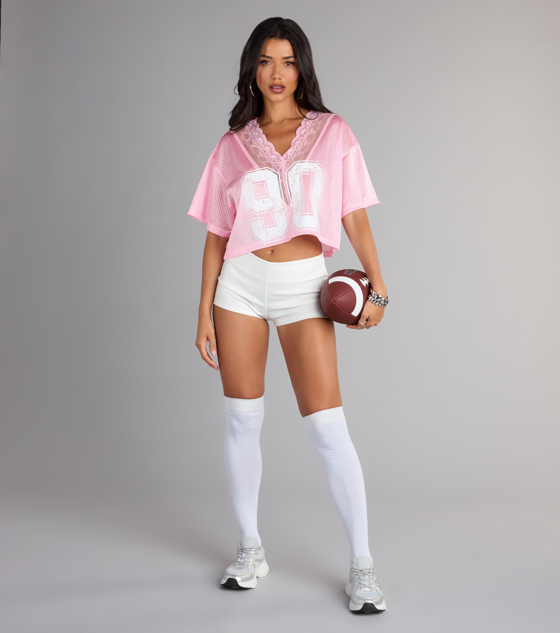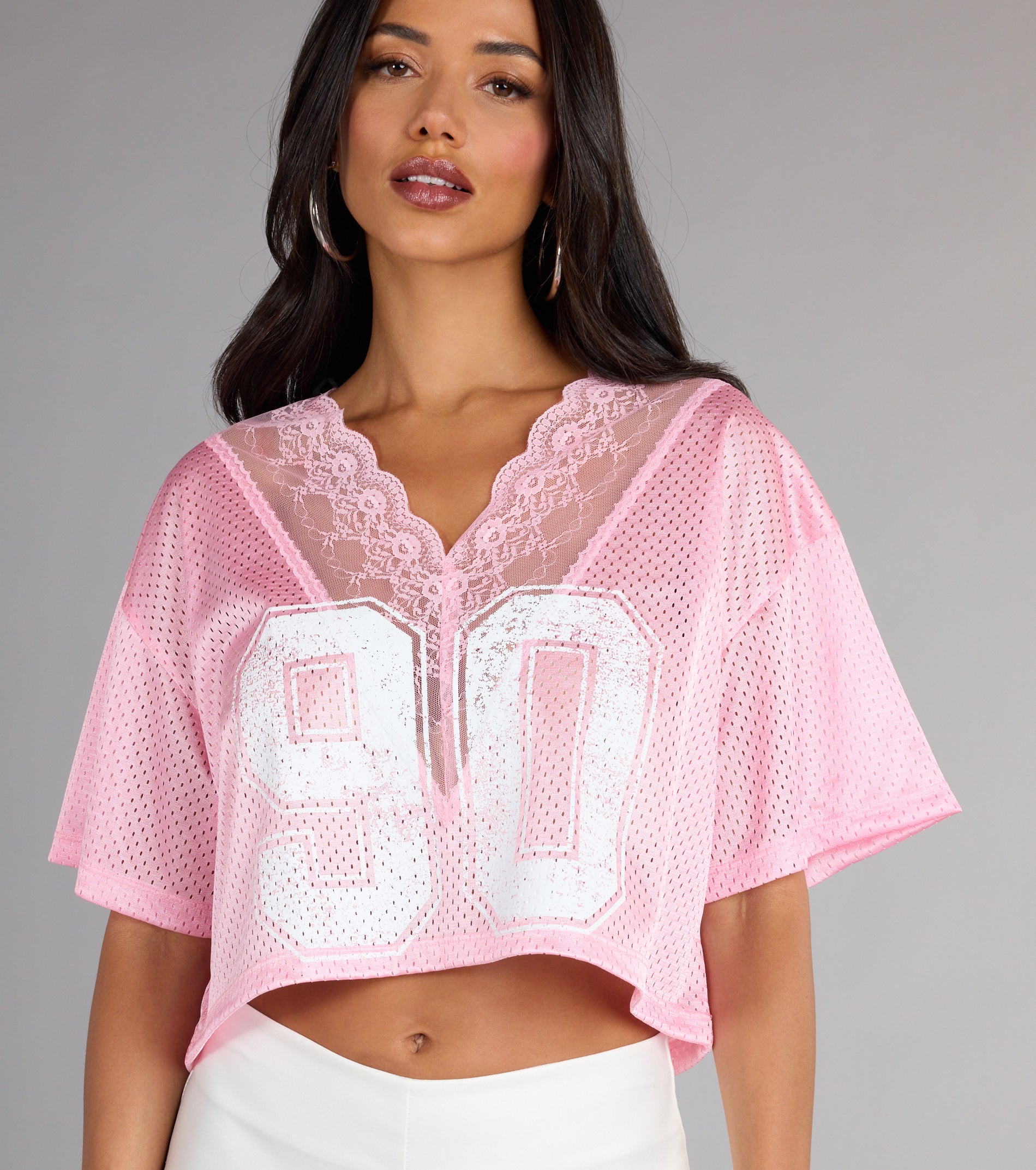 Rock the 90s lace trim mesh graphic t-shirt top with its sheer mesh vibe and lace V-neck. Perfectly cropped to flaunt your style with a cheeky nod to the past.
