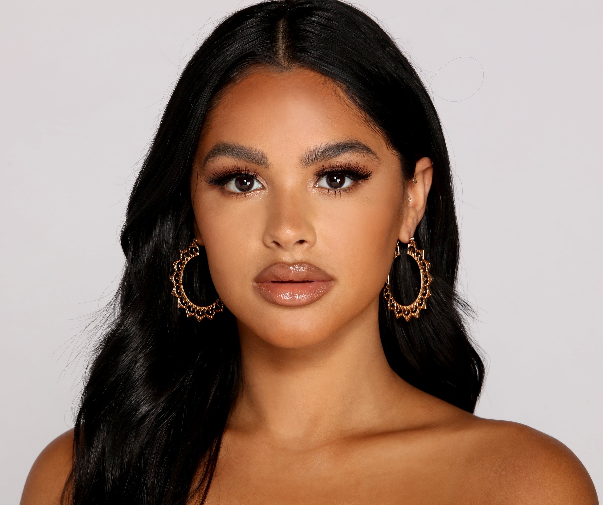 Rock a pair of hoops for your glam and basic moods! This multipack features three pairs of hoops that feature a filigree design. a basic flat metal. and a glitter embellished design. Complete look with a and hoops for a brunch-ready look!?