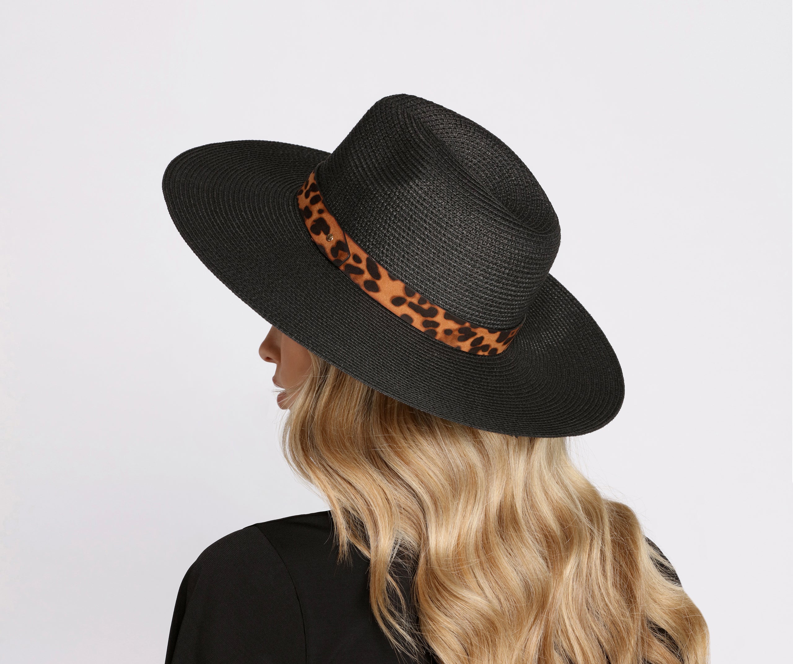 Bring a fun element to your summer look with a touch of leopard! Style this dark yet summer-y hat with a flowing bell sleeve romper. or a black summer mini dress!