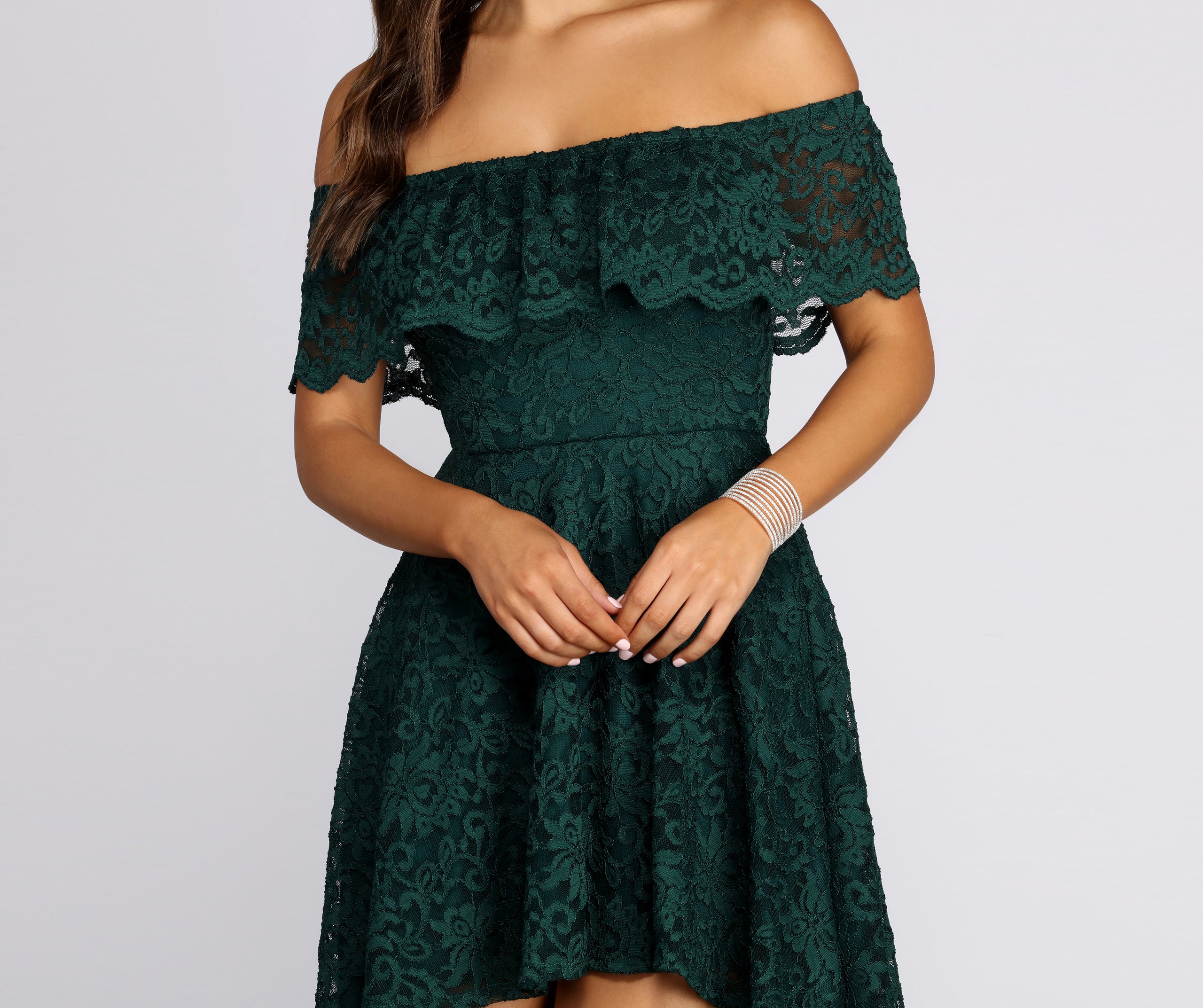 Add some flair to your style with this adorable lace skater dress! It features an off the shoulder neckline with a sheer lace overlay. a high waist seam. and a flowy skater skirt with a high low hem. The dress is composed of a sheer lace fabric with a full knit lining and has moderate stretch.