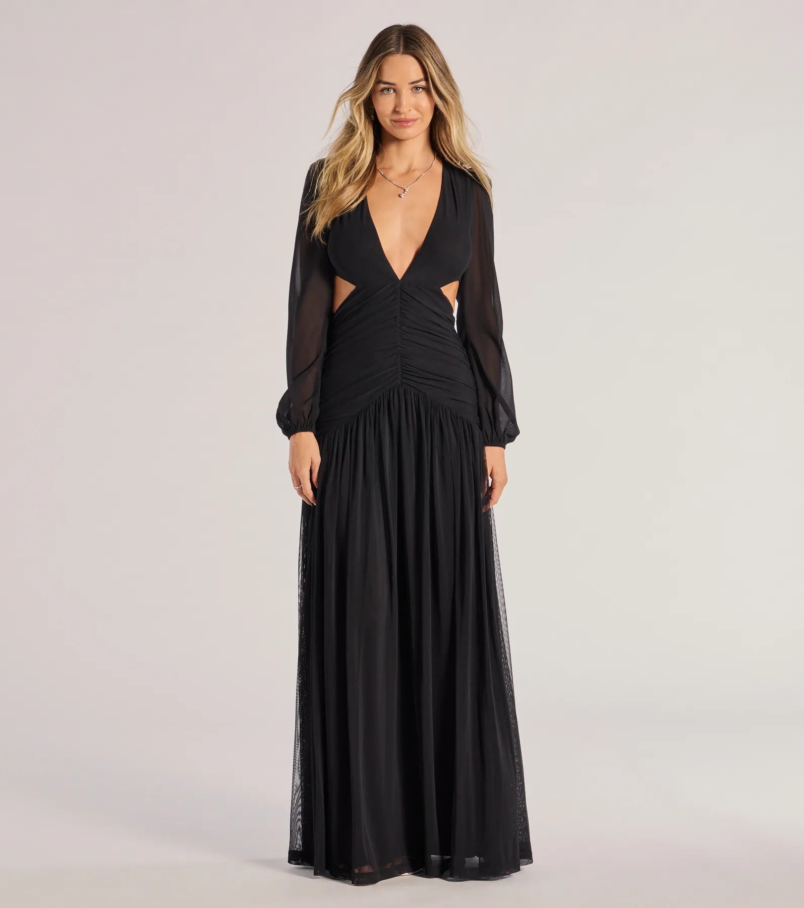 Showcase stylish sophistication in the Adley dress accented with chic details on mesh fabric that are sure to turn heads at your next formal affair. It features a plunging V-neckline for an alluring look. sheer long balloon-style sleeves. asymmetric cutouts at the waist. a ruched drop waist design. and a floor-sweeping pleated A-line silhouette.