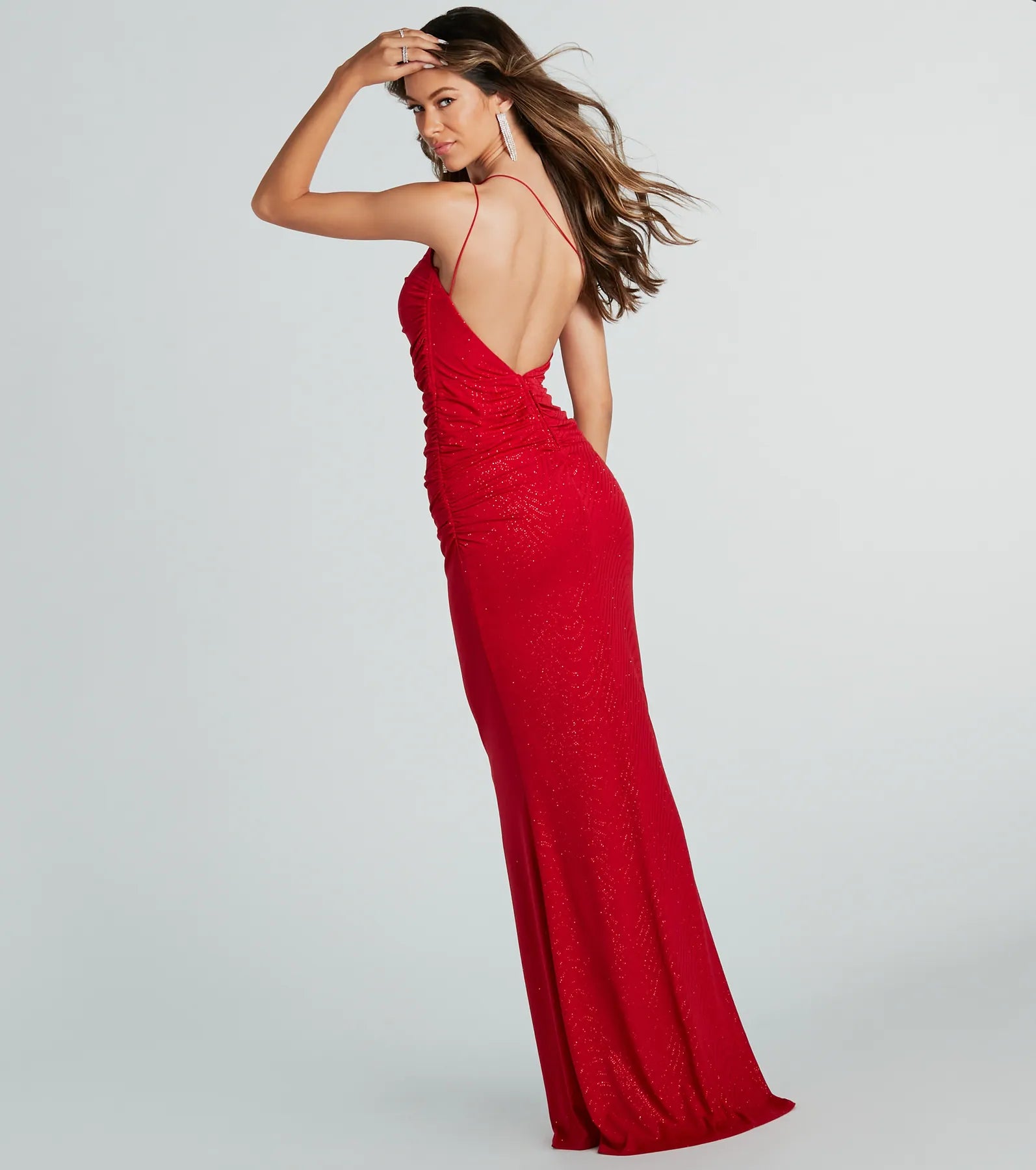 Bring the glitzy allure with the gorgeous glitter detailing of the Aileen formal mermaid dress! She features a sleeveless asymmetric one-shoulder neckline with a built-in padded bust. dual spaghetti straps that lead to a strappy back design. ruched detailing at the waist. a dramatic floor-sweeping hem with a figure-flaunting mermaid silhouette. and a glamorous glitter swirl pattern on the knit fabric. Complete your red-carpet-worthy look with for that luxe sparkle.