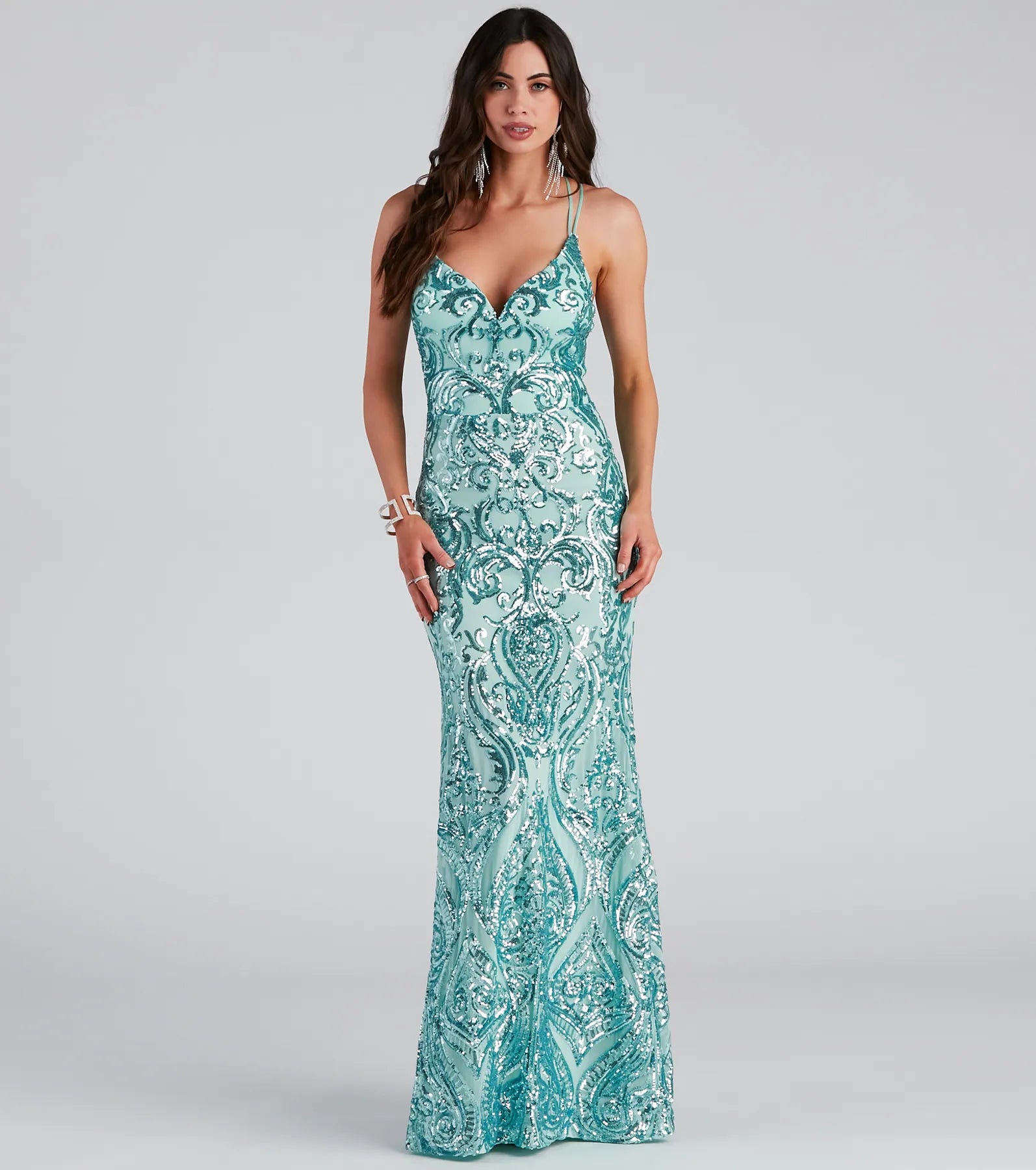 Enchant at the prom in the Aliyah formal sequin dress perfect for making a dazzling grand entrance. She features a sleeveless. v-neck. sleek adjustable straps. and a built-in padded bust. Her form-fitting bodice leads to an alluring open-back with strappy detail and zipper closure. Her floor-length mermaid silhouette is designed to flatter every figure. The formal dress is composed of a sequin embroidered fabric with an inner lining and no stretch. Complete the look with a chic