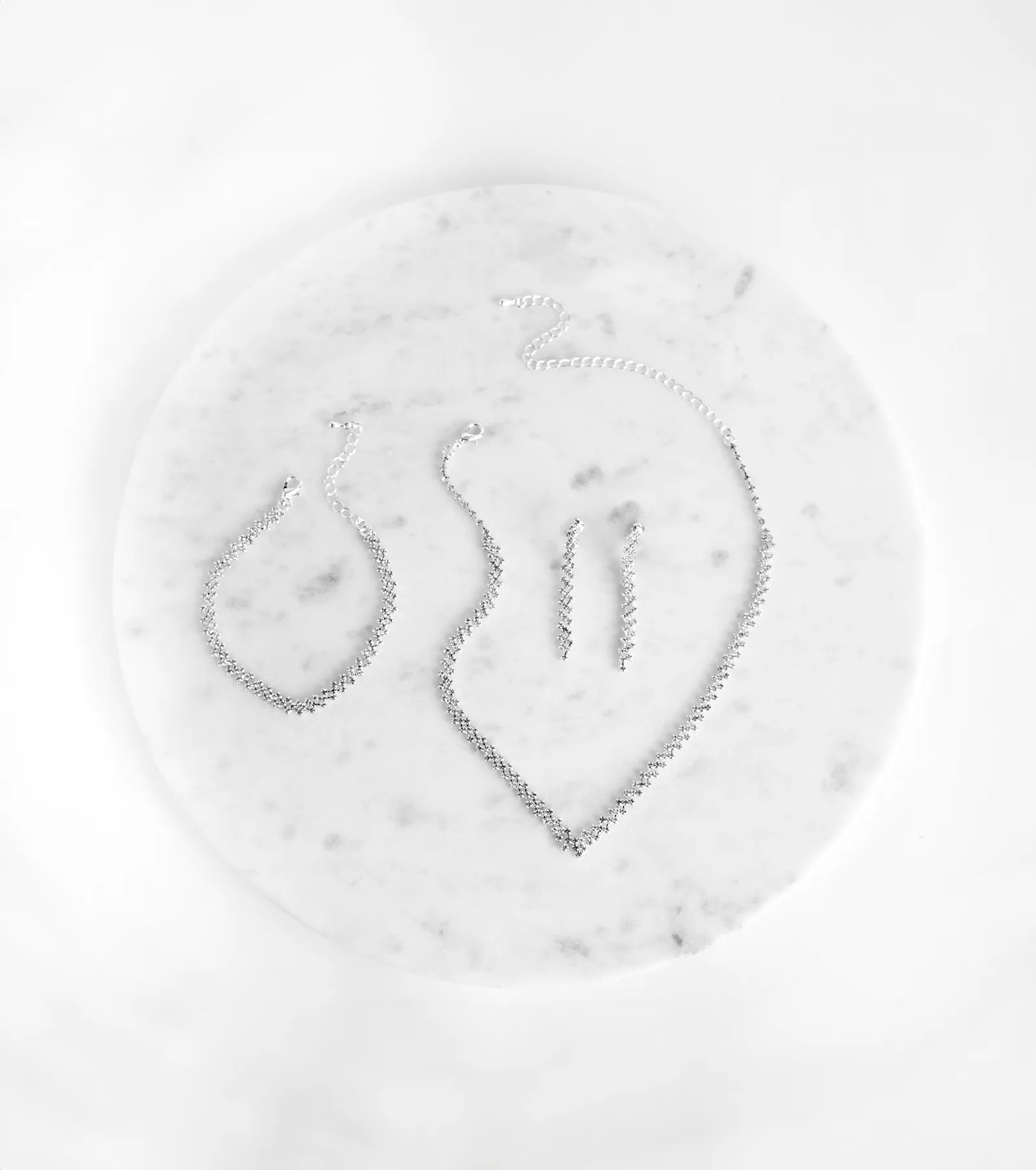 This matching necklace and earrings set is the easiest and most elegant way to finish your look. Featuring a rhinestone necklace. duster earrings. and bracelet. you’ll look on point. The necklace and bracelet each come with a lobster clasp closure for easy wear. With this set. you’ll be ready for your next fancy dinner with bae! Pair with a and and shine on babe.