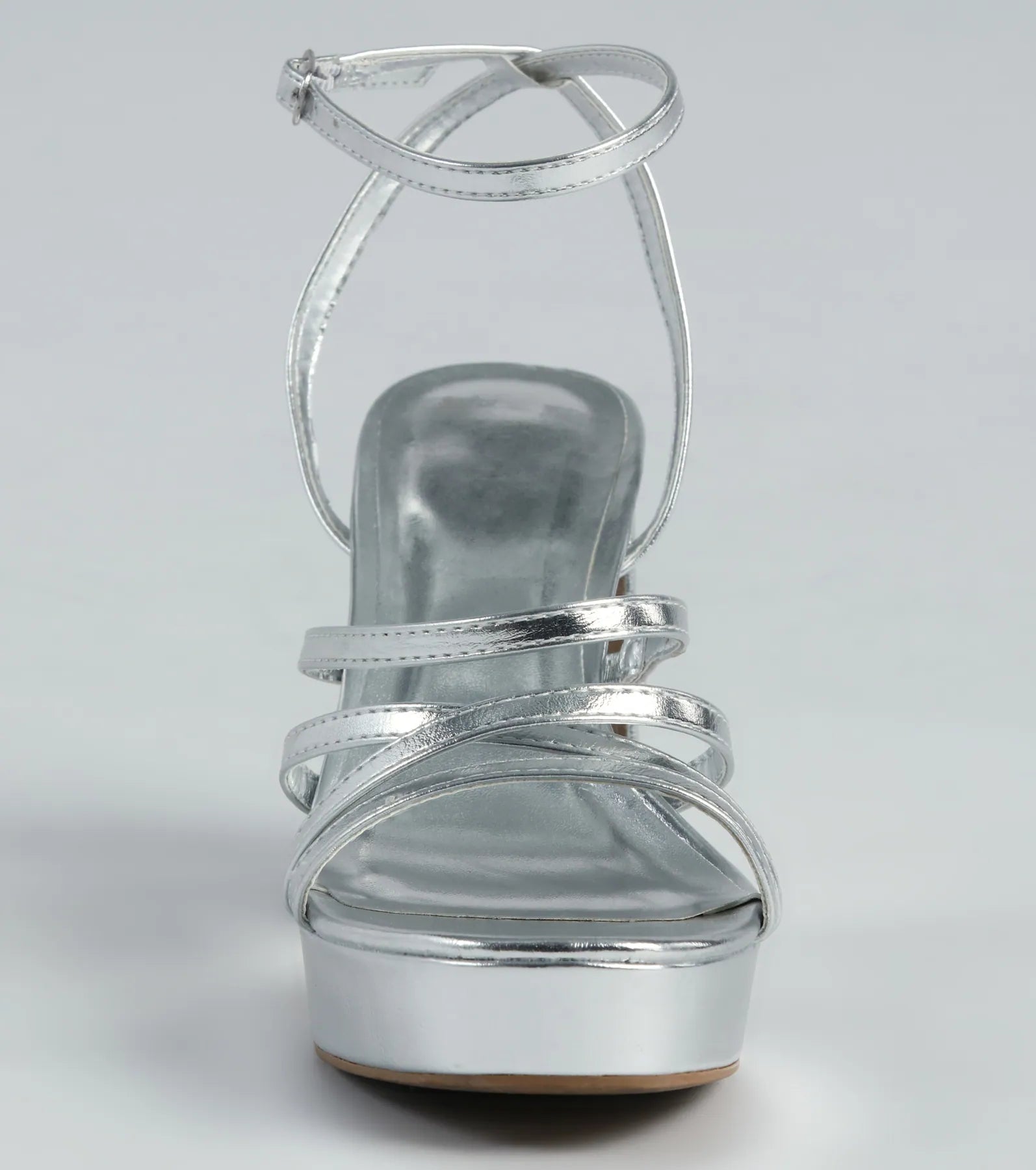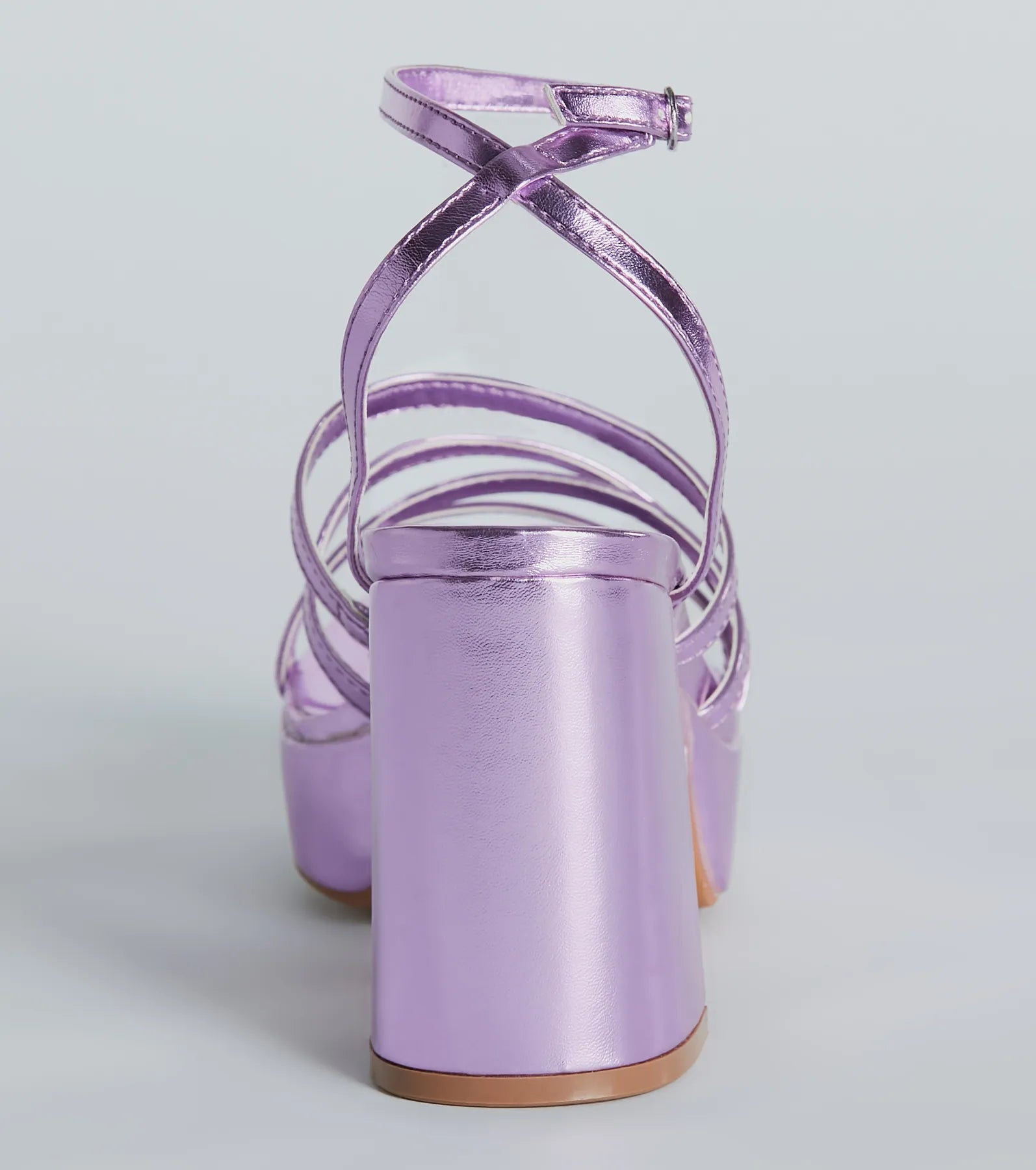 Bring your look to a shining new level with these metallic heels. With a square toe. strappy design. and block heel. these stylish heels offer chic sophistication with a platform sole to ensure comfort. The metallic material adds a luxe touch for a look that really shines. Complete the look with a sparkly for a dressy occasion!