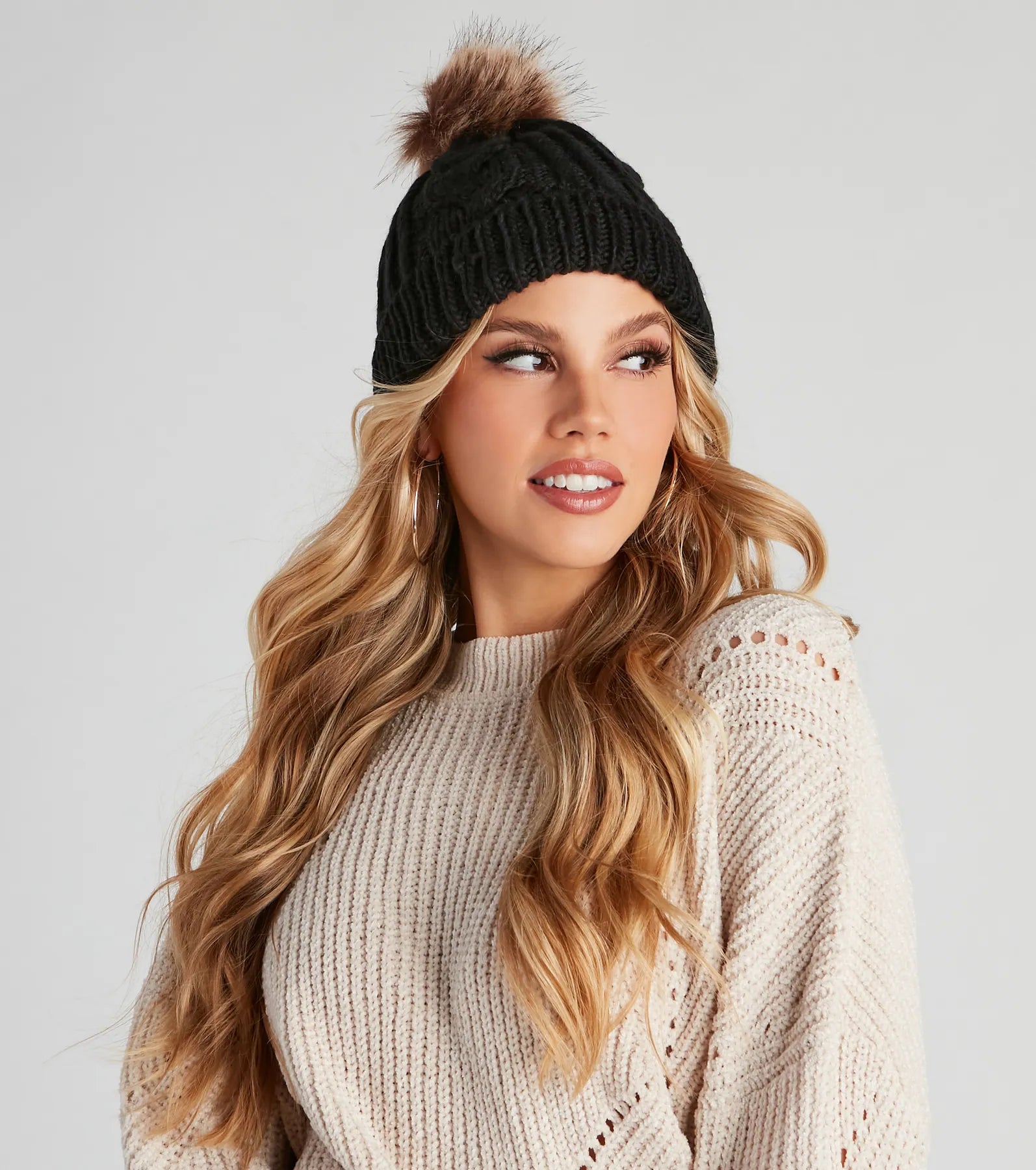 Keep your winter ‘fit cozy with this adorable knit beanie! It features a ribbed fold-over hem. a cable knit design. an ultra-plush faux fur lining to keep you warm. and a top fuzzy faux fur pom detail. Style this cute beanie with your favorite .
