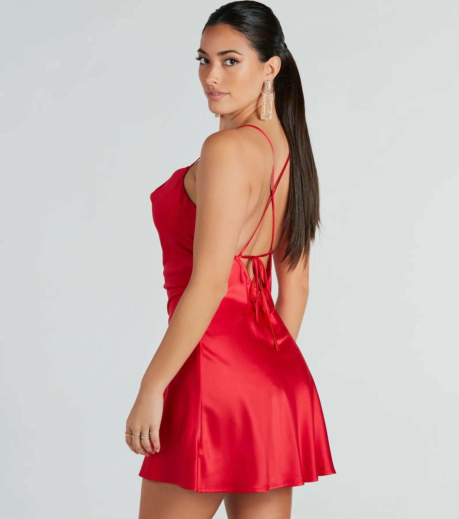 Oh-so-alluring and romantic will be your vibe in this sleek satin mini dress! Crafted from a silky lightweight satin fabric. this mini-length dress features a sleeveless cowl neckline. spaghetti straps. and an open back with a cross-back strappy design with a tie closure for an adjustable fit. and a flirty. flowy A-line silhouette. Style with and rhinestone heels for a dressy date night.