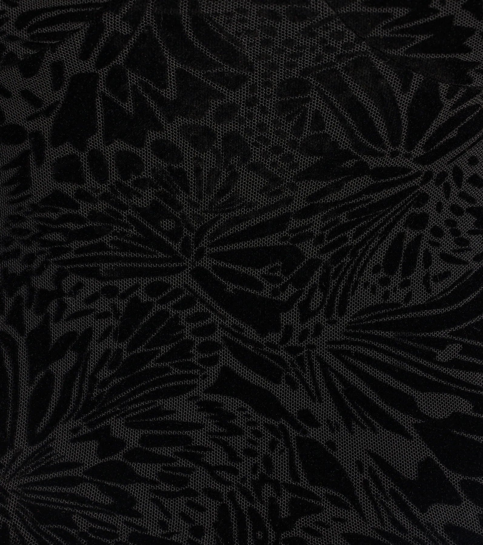- Sheer mesh fabric with velvet flocked floral pattern. partial front knit lining