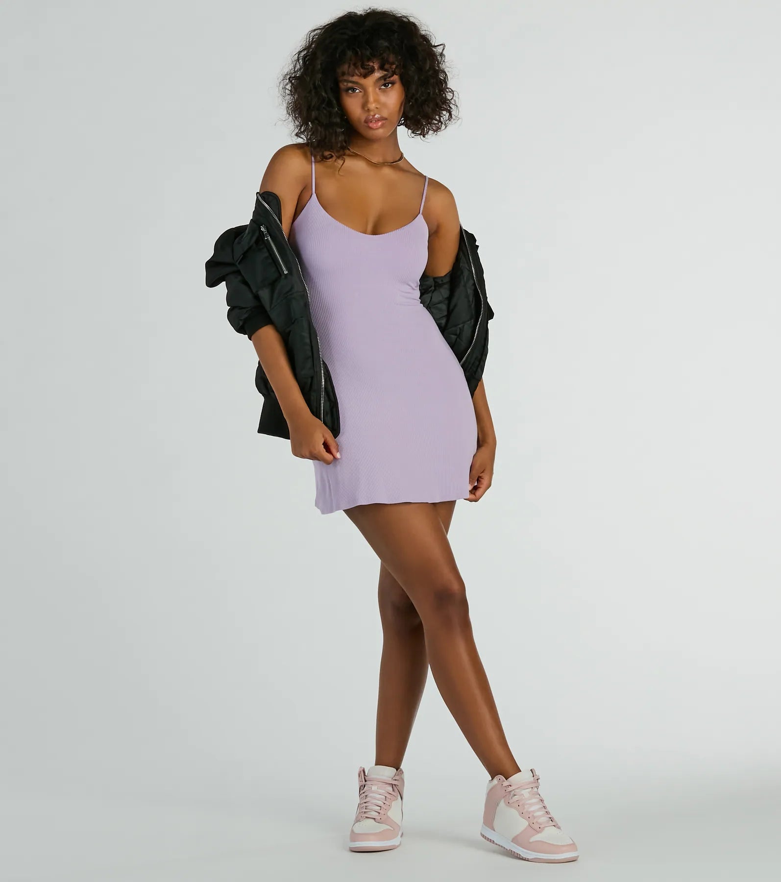 You’ll always admire having this sleeveless mini dress for dressing up or down! Made from lined stretchy rib knit fabric. this dress hugs your curves in a flattering A-line silhouette. The scoop neckline and thin spaghetti straps add a flattering look. Style with a cute and your favorite sneakers!
