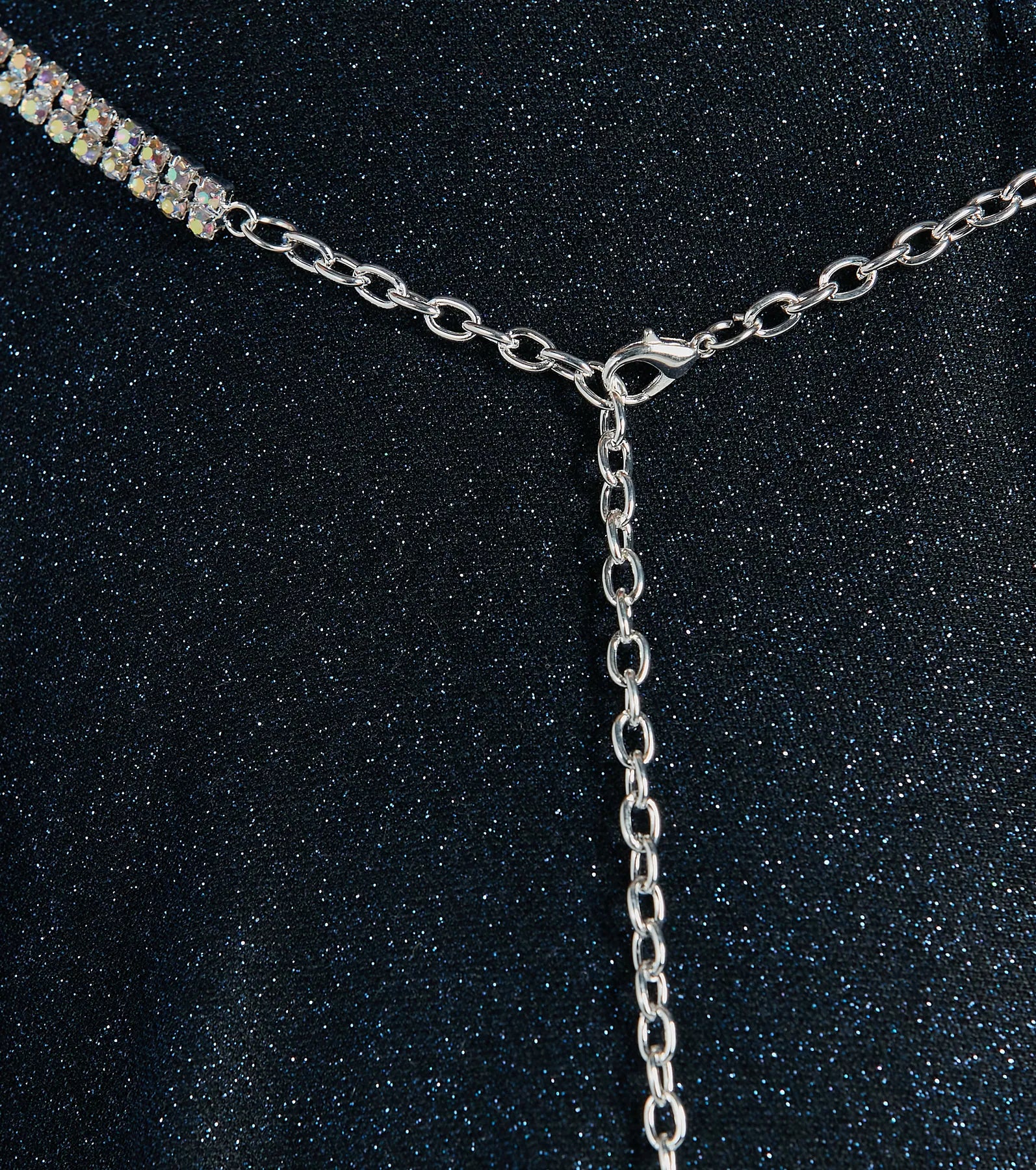 Always classy and chic! Finish your prom look in this rhinestone belt featuring a unique slanted two-row design with a back adjustable chain and lobster clasp closure. Perfect for styling with the matching sparkly bag and heels!