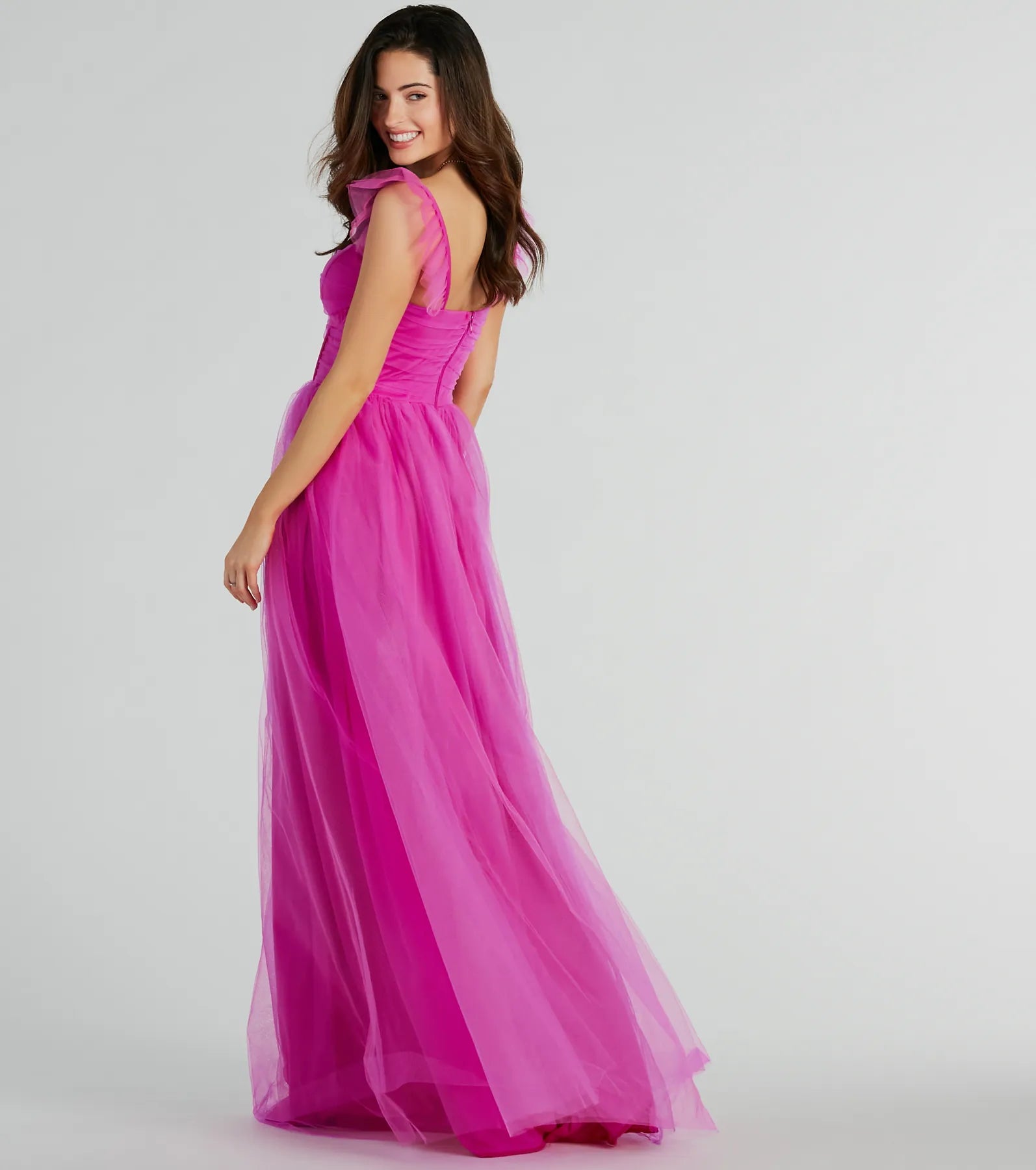Classic with a modern twist. the Amber tulle formal dress is beautifully bold and perfect for prom. sweet sixteens. and balls! She boasts a sweetheart neckline and ruffle trim spaghetti straps for a romantic touch. The corset bodice with built-in padded underwire bust and flexible boning ensures a flawless and snatched fit. The A-line silhouette and floor-length hem in soft tulle create an elegant and timeless look for any formal occasion! Complete the look with rhinestone earrings. a clutch. and for a memorable night!