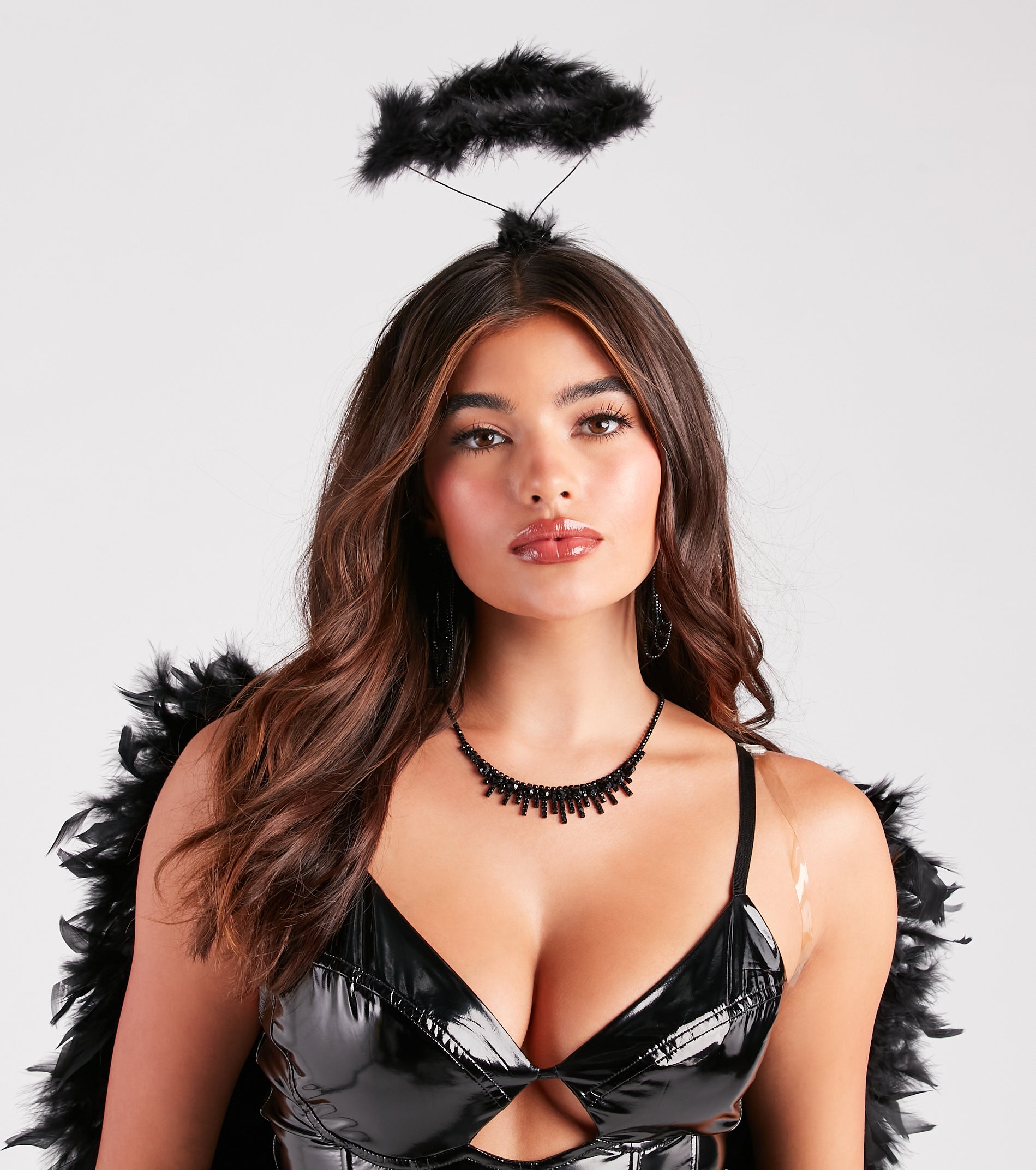 Be naughty or nice this Halloween using this marabou feather halo headband as part of your angel costume! It features a wired halo with a fab marabou feather trim attached to a satin ribbon headband. Complete your with feathered wings. a sexy dress. and gloves to attend a Halloween party or night-out event!