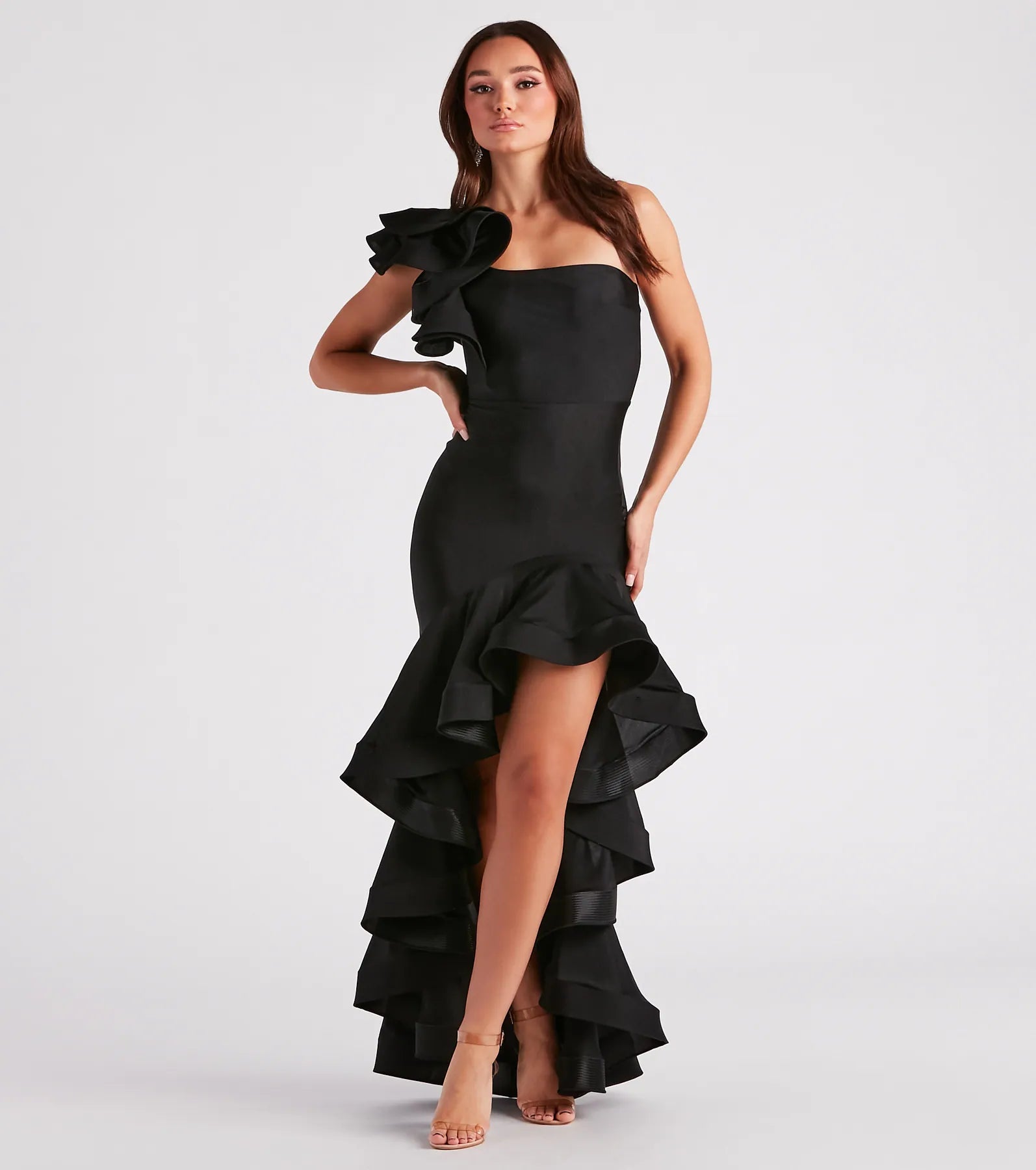 Timeless with an eye-catching twist. the Audrey long formal dress is ready to make your acquaintance for banquets. ceremonies. and black-tie events. She features a striking sleeveless one-shoulder neckline. a bonded ruffled design for a structured look. a flattering mermaid silhouette. and a bonded ruffled long-length hem. The formal dress is composed of a sleek scuba knit fabric with plenty of stretch. Complete the look with a clutch and .