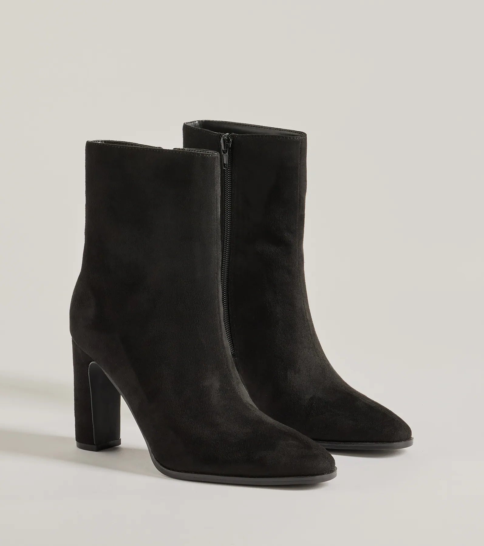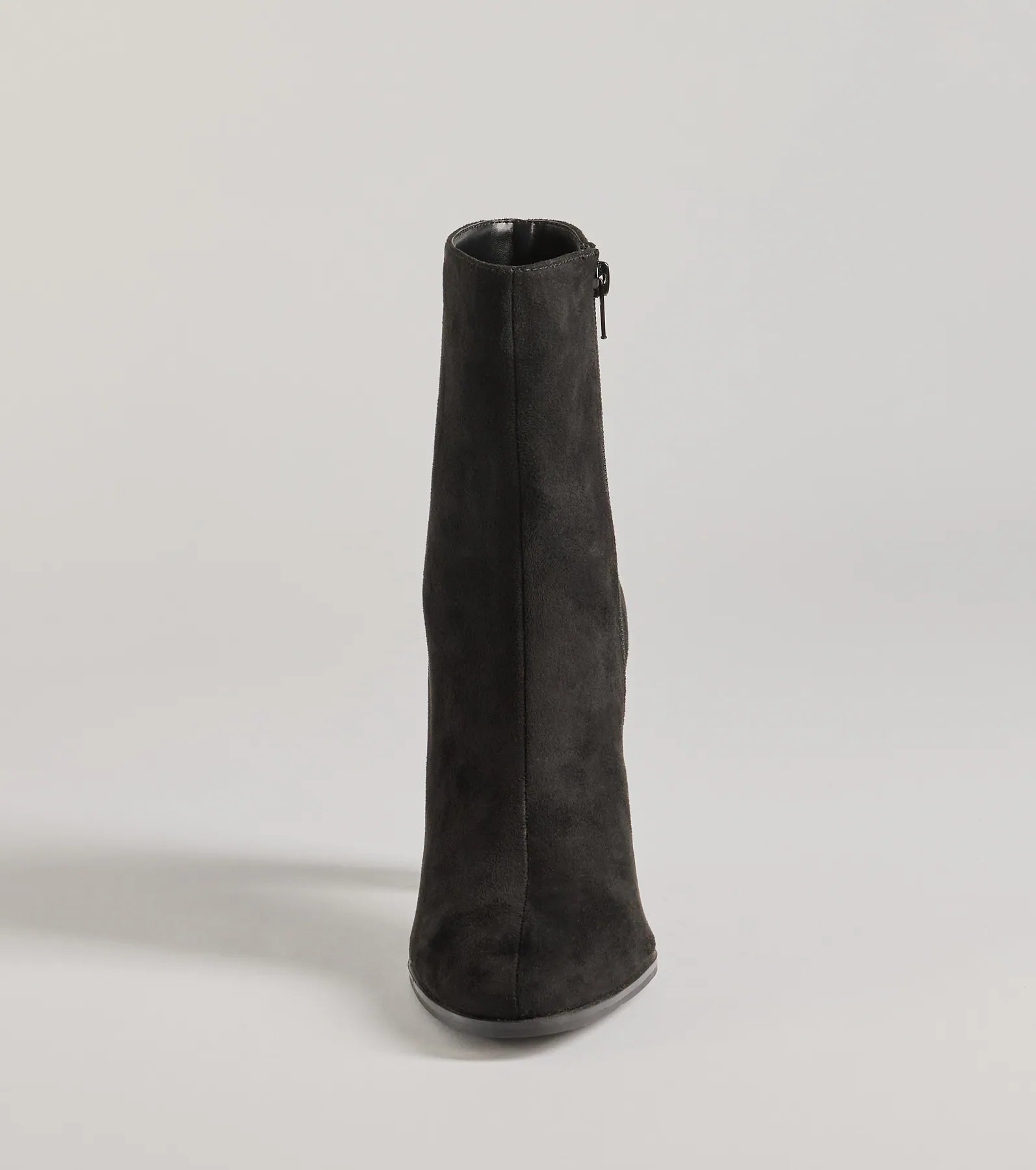 Step up your style game with the back to basics block heel ankle booties. Featuring a chic block heel. faux microsuede. and a sleek pointed toe. these booties are your new go-to for any outfit.