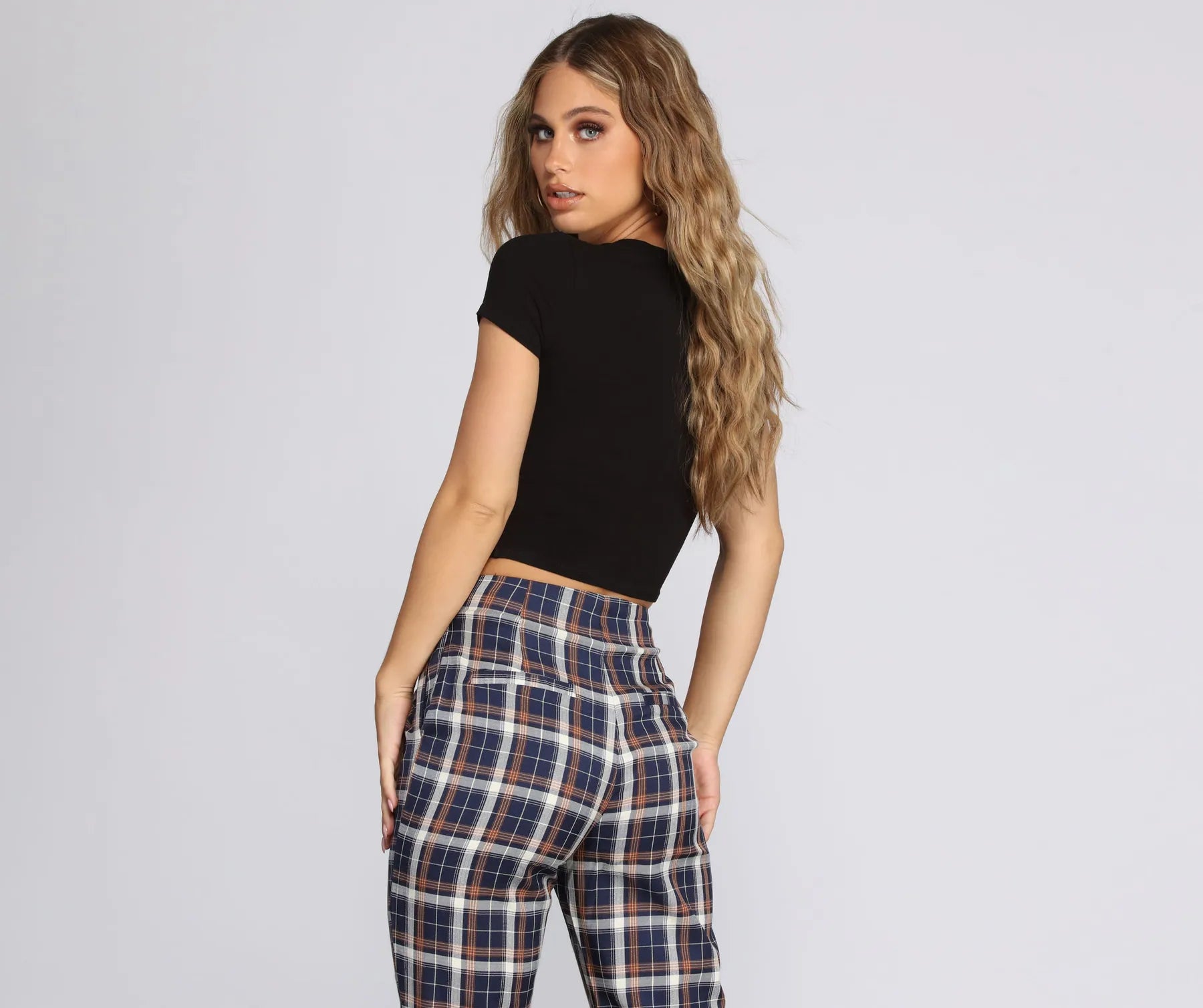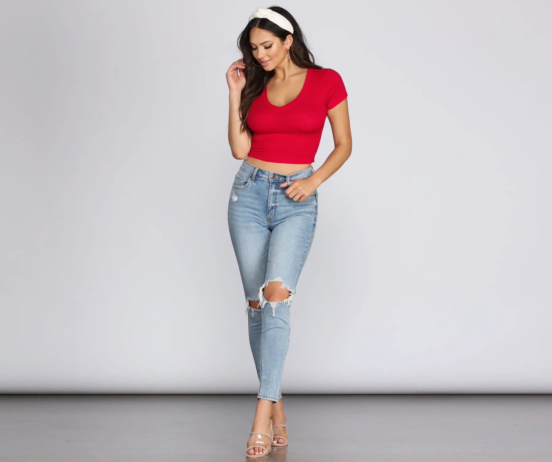 Its basically always a good time to add a staple basic piece to your closet. This tee features a deep V neckline. a quarter shoulder sleeve and a mid crop hem. The top is composed of a smooth cotton like fabric that offers a moderate stretch with a form fit.