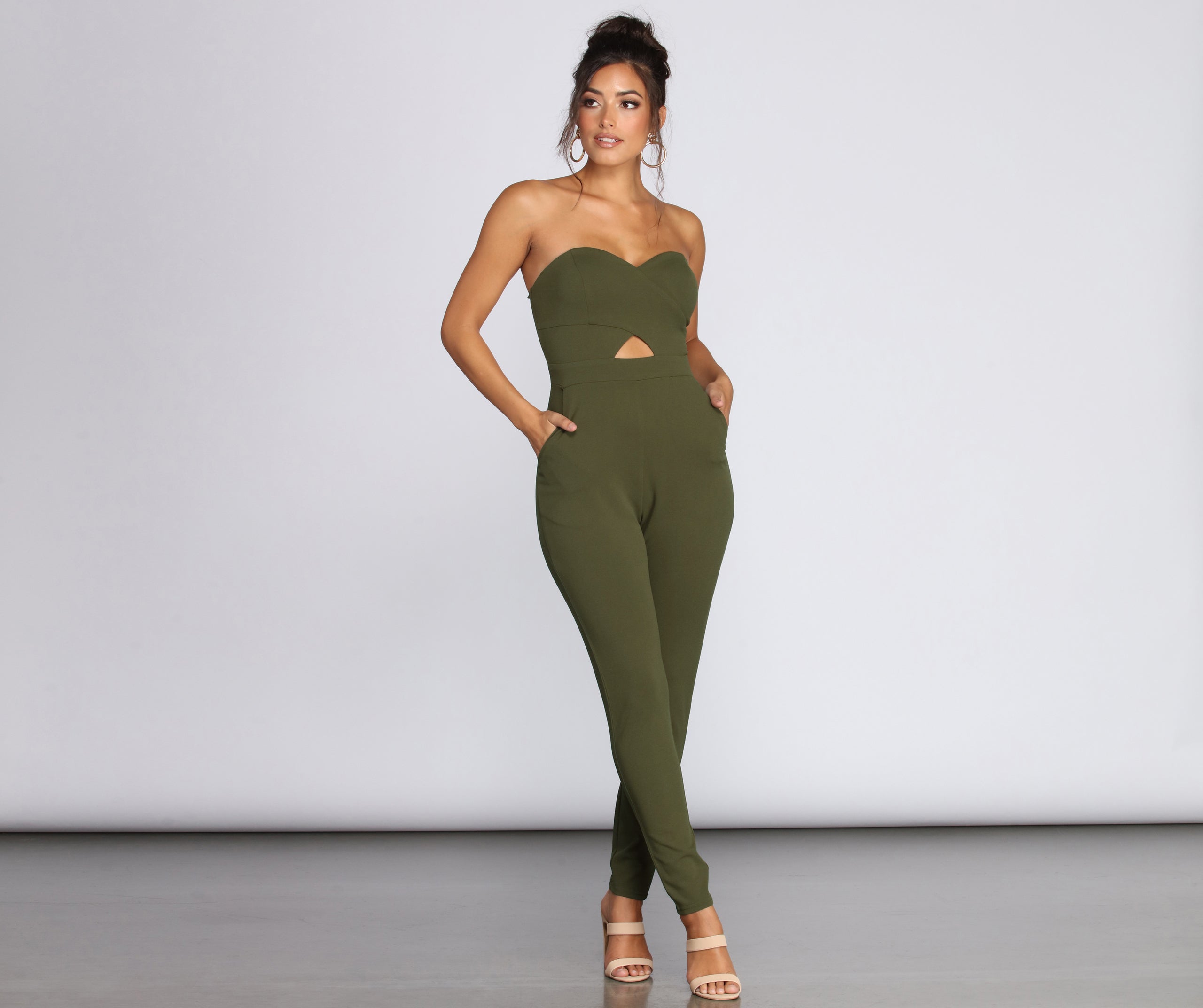 A little utilitarian and a lot chic. this crepe jumpsuit guarantees all eyes on you. The suit features a strapless sweetheart neckline. a seamed. lightly padded bodice with elasticized zippered back and cutout detail above the waist. pockets at either hip and legs that are slightly fuller through thigh and taper gently towards hems. The jumpsuit is made of lightweight woven material with modest stretch. Complete look with .