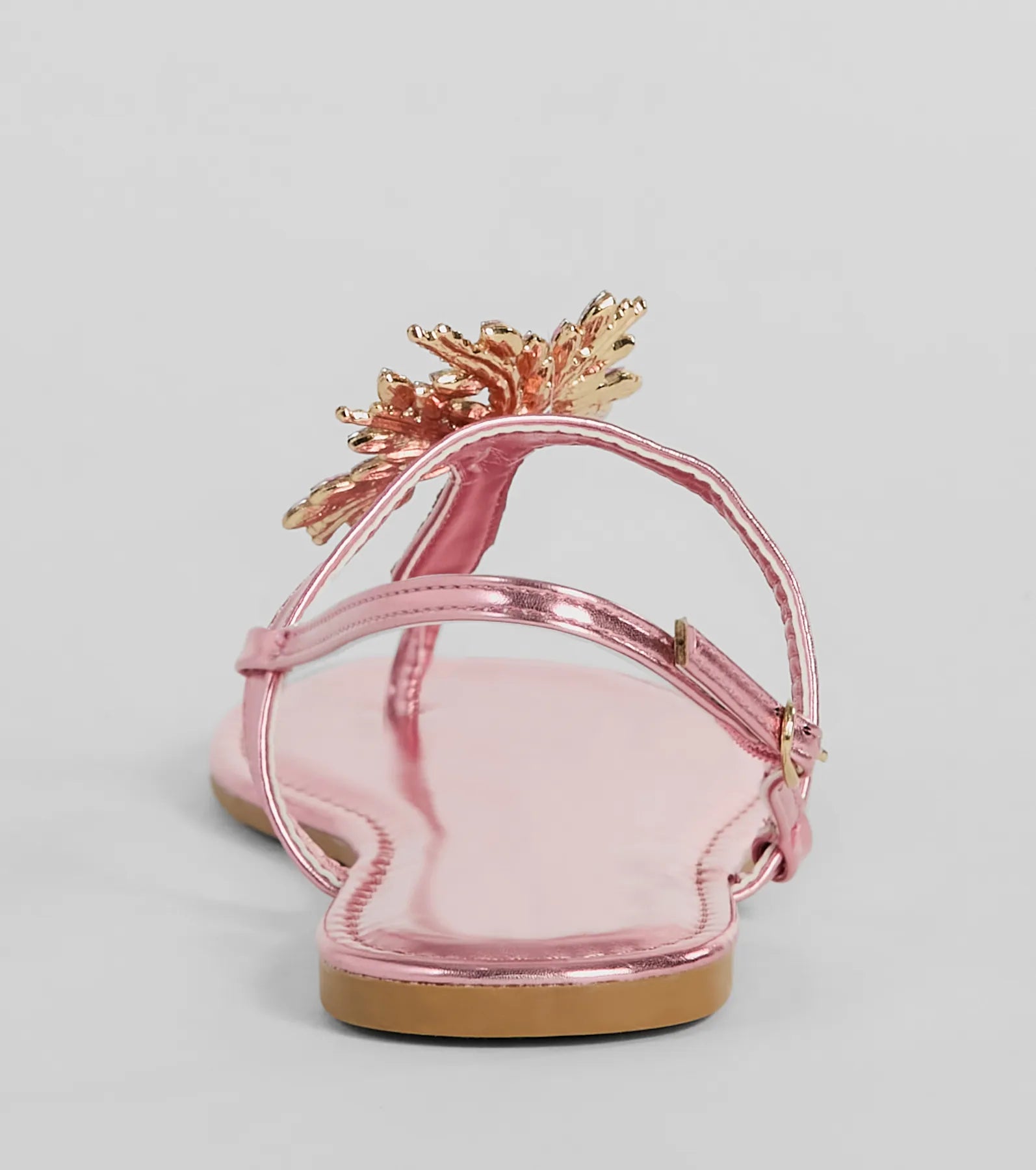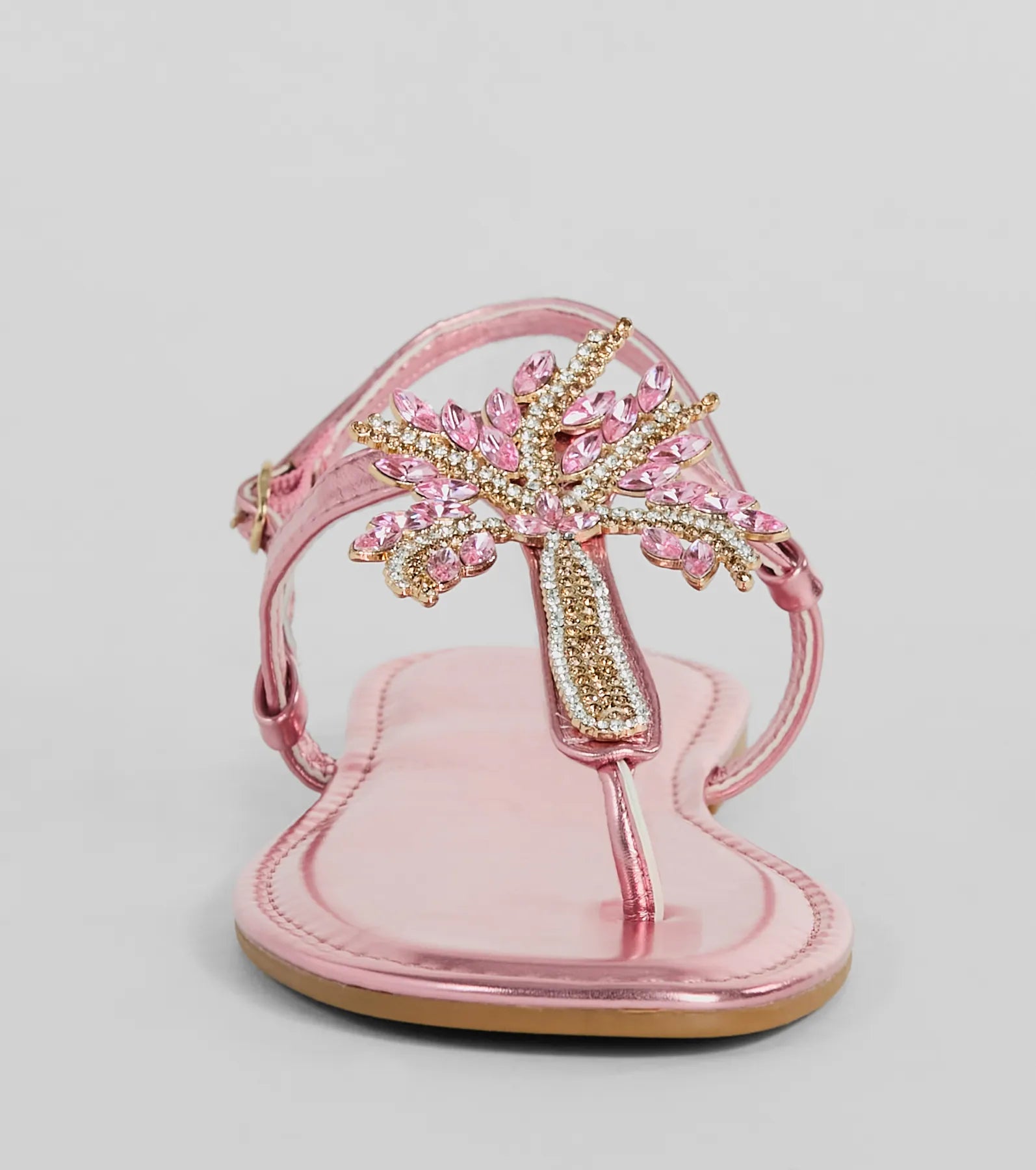 Level up your fabulous vacay ‘fits with these glam rhinestone metallic sandals! Made with sleek faux leather with a metallic sheen. they feature a square-shaped toe. a thong strap with a glitzy rhinestone-embellished palm tree design. an adjustable ankle strap with a buckle closure. and a flat sole for comfortable wear. Style with a and hoop earrings for a beachside dinner!