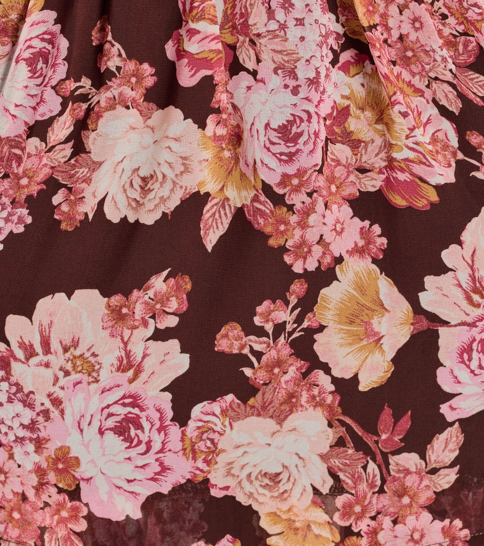 This floral chiffon formal dress features a flirty sweetheart neckline with padded bra cups for support. scrunched shoulder straps. a high front slit. and a flowy A-line ruffled floor-length silhouette. Perfect for homecoming or a wedding.