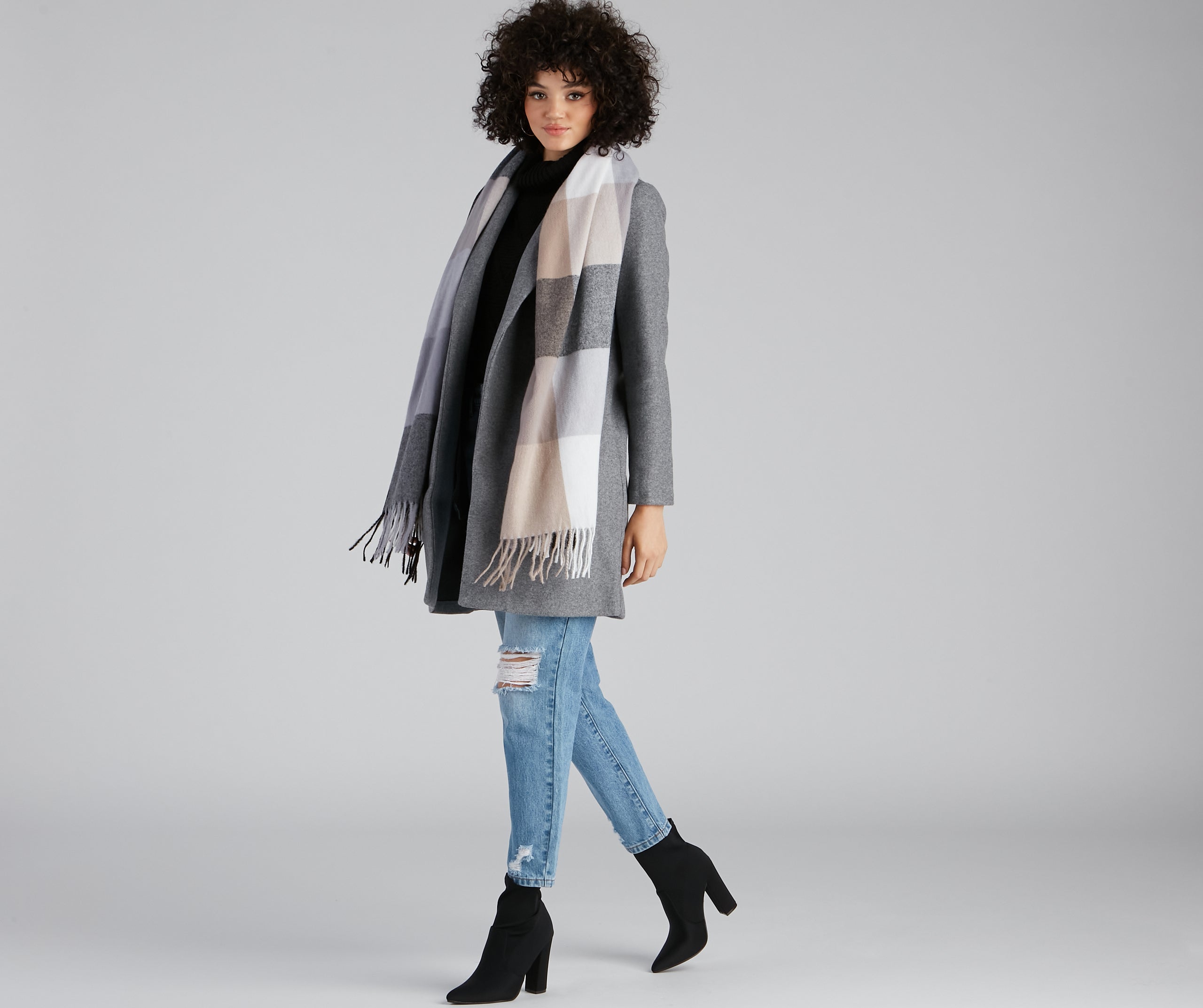 You’ll be so chic ib the city with this plaid fringe scarf. Composed of a brushed woven fabric. Perfect for styling with a and boots.