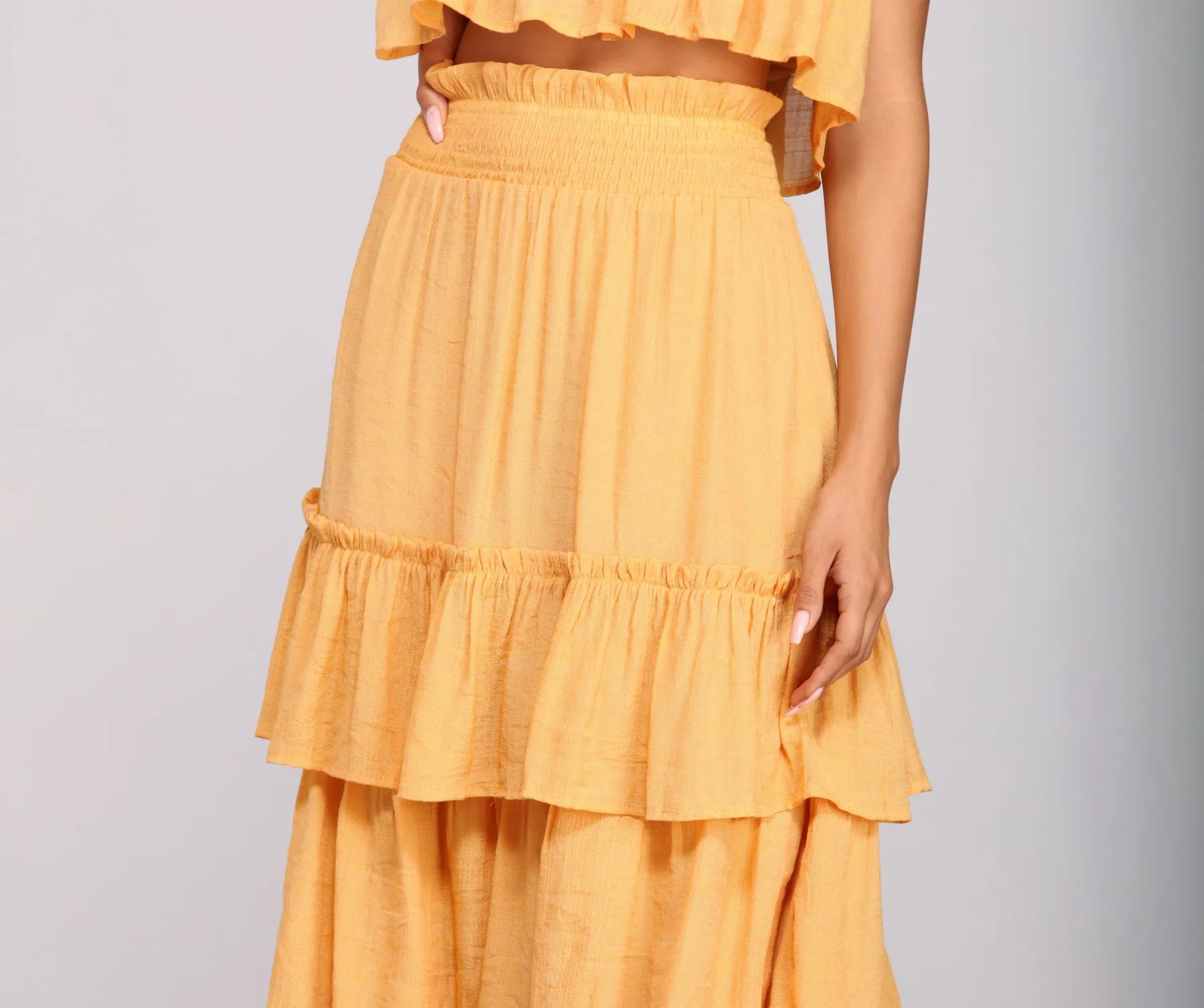 Feel the flow in this low-key chic tiered maxi! A-line skirt features a smocked elasticized waist and three tiers of ruffles. Pair it with the matching crop top for maximum groove! Skirt is lined. slips on. and is made from a lightweight woven material with stretch in the waist.