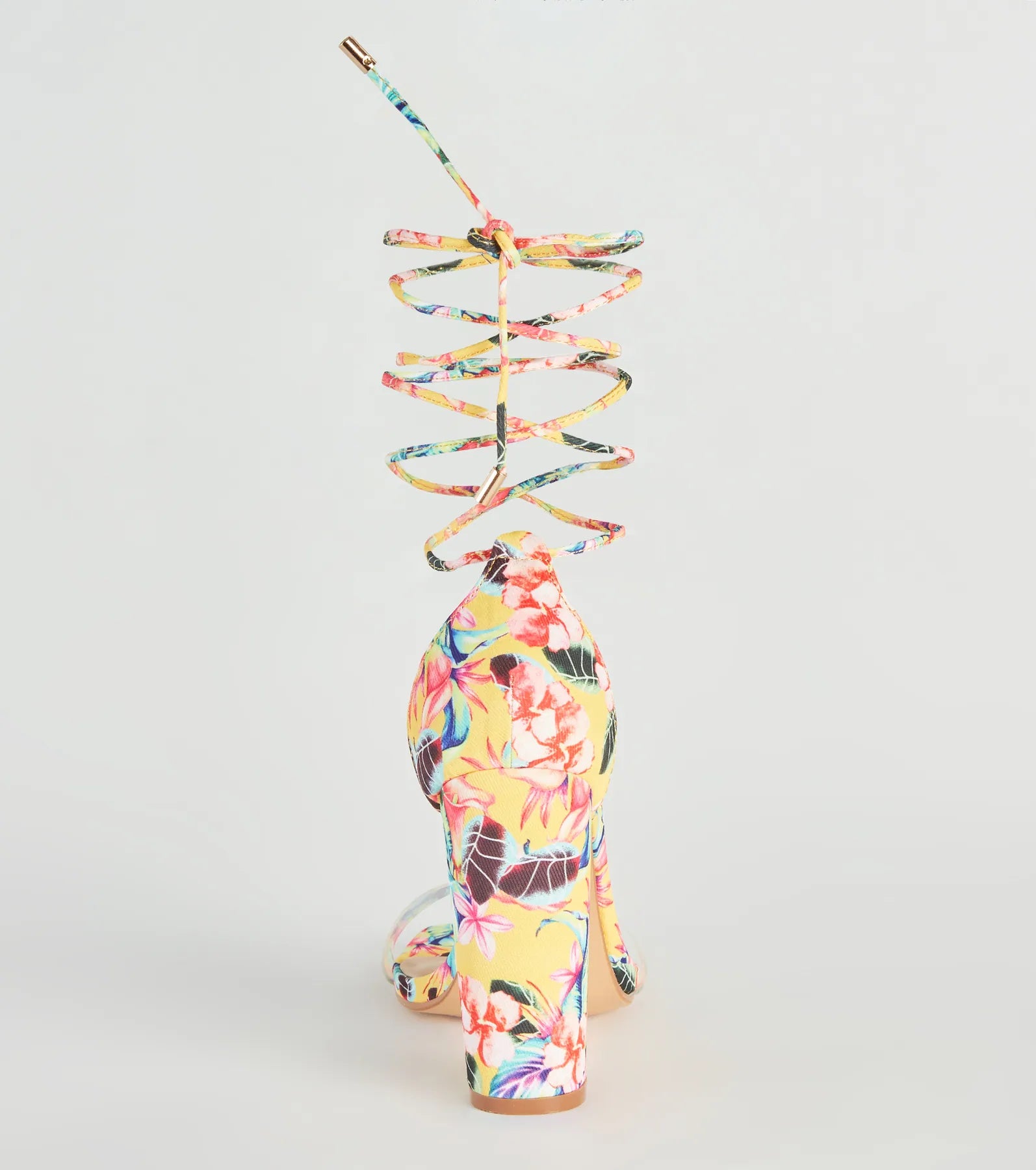 Strut into your next party in bold style with these fabulous floral block heels! They feature an open square toe. a clear toe strap. a closed back. a thin lace-up strappy design that wraps around the leg. a sturdy block heel. and an all-over tropical floral print pattern that will catch everyone’s attention. Complete the look with hoop earrings and a .