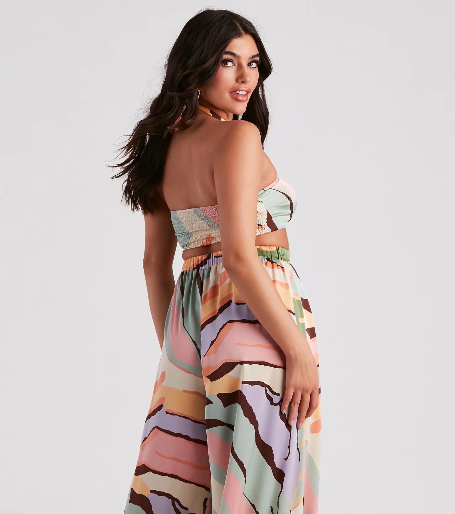 Bring the heat to your spring break look with this trendy crop top that will get everyone’s attention! It features a sleeveless sweetheart neckline with a padded bust. thin halter straps with multiple ways to style. a stretchy smocked back. an ultra-cropped hem. and a sassy abstract printed design. Style with the matching wide-leg pants to be vacay-ready!