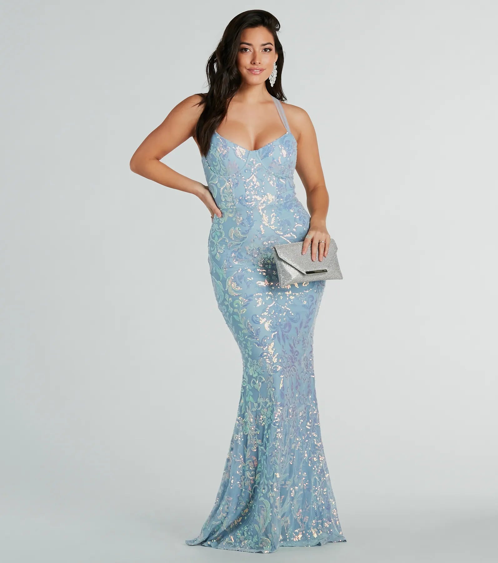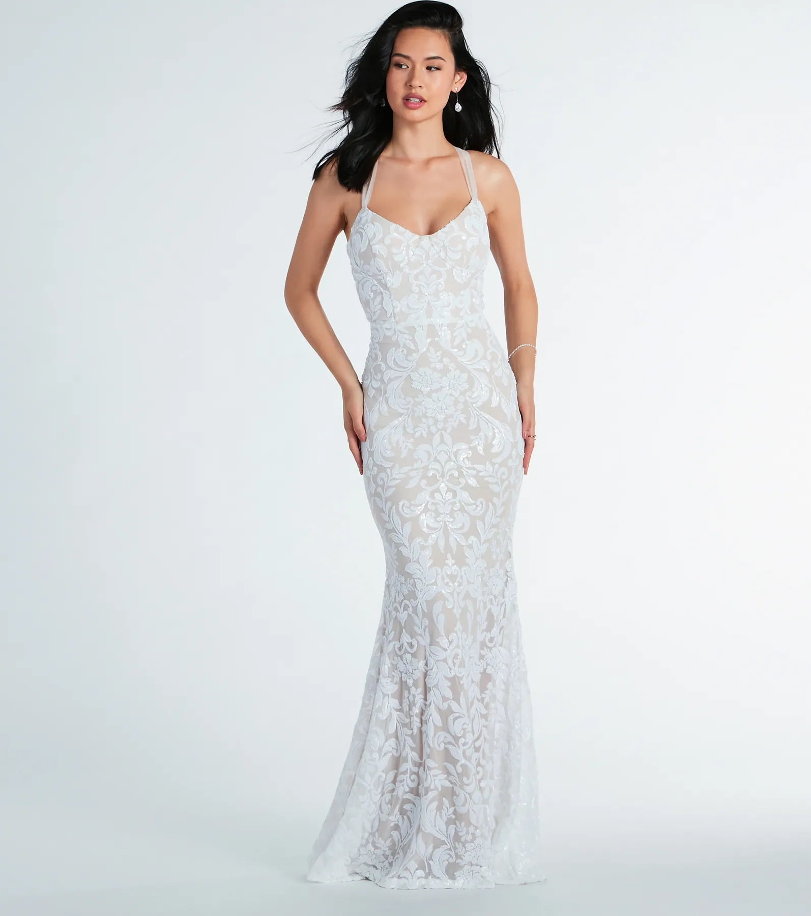 If you’re looking to shine and stand out. the Brooklyn sequin long formal dress is a fresh option for brides. prom. and black tie events! Crafted with a sequin-scroll pattern on mesh fabric. this formal gown will leave everyone speechless with its sparkle. The sweetheart neckline and bustier bodice provide a flattering silhouette. while padded underwire bra cups and flexible boning offer enhanced support. Tulle straps and a lace-up back add a touch of delicacy. making this dress perfect for any formal occasion. Complete the look with grand for a flawless finish!