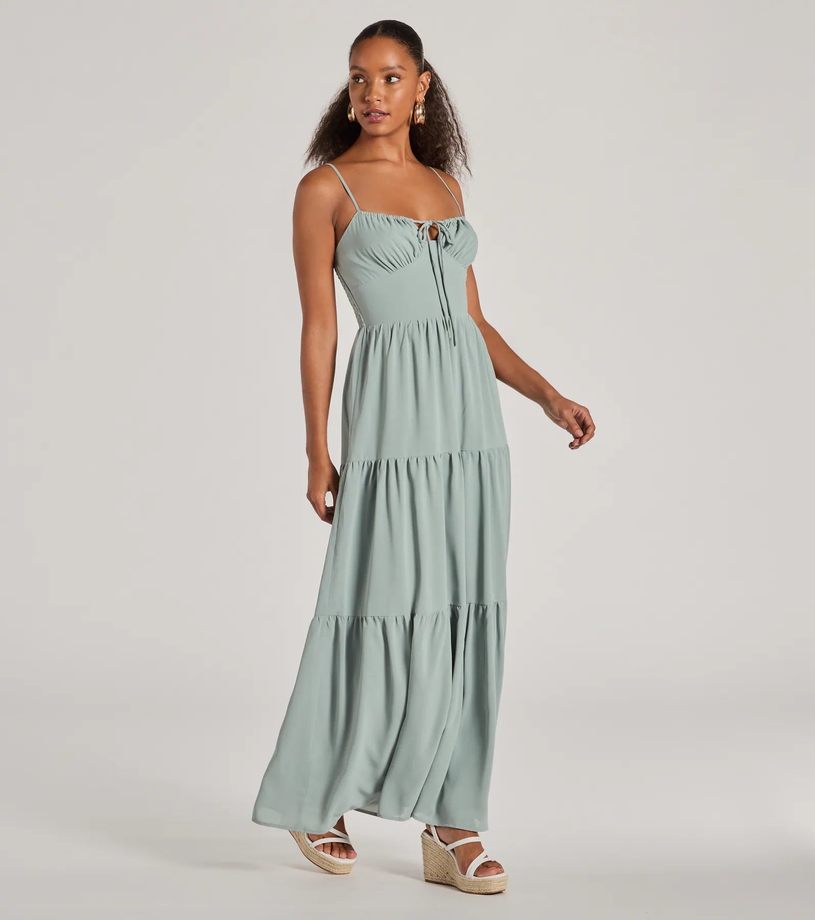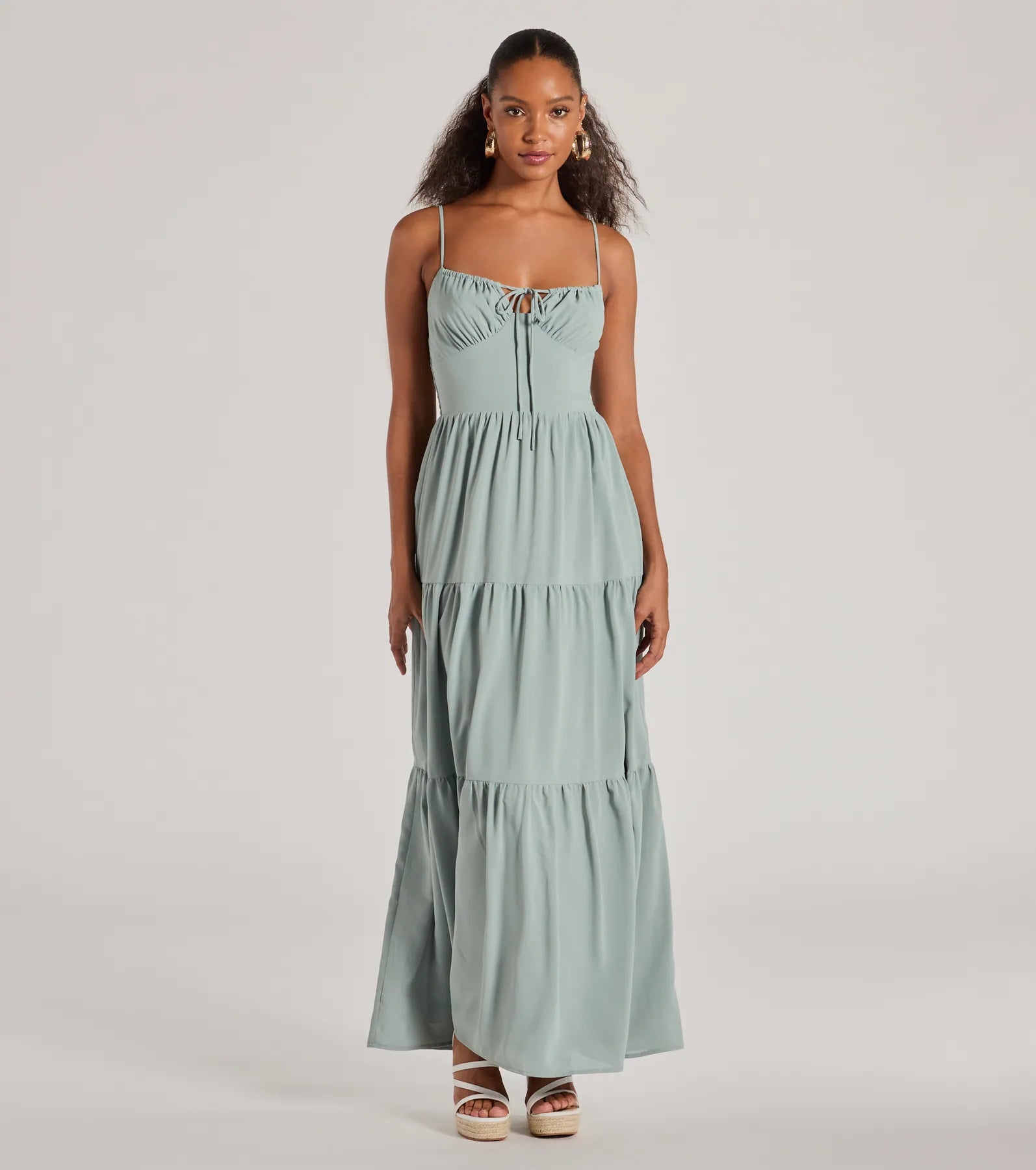 A casually chic sleeveless maxi dress with dreamy warm weather vibes. a flirty bust tie. and a flowy. ruffled silhouette!