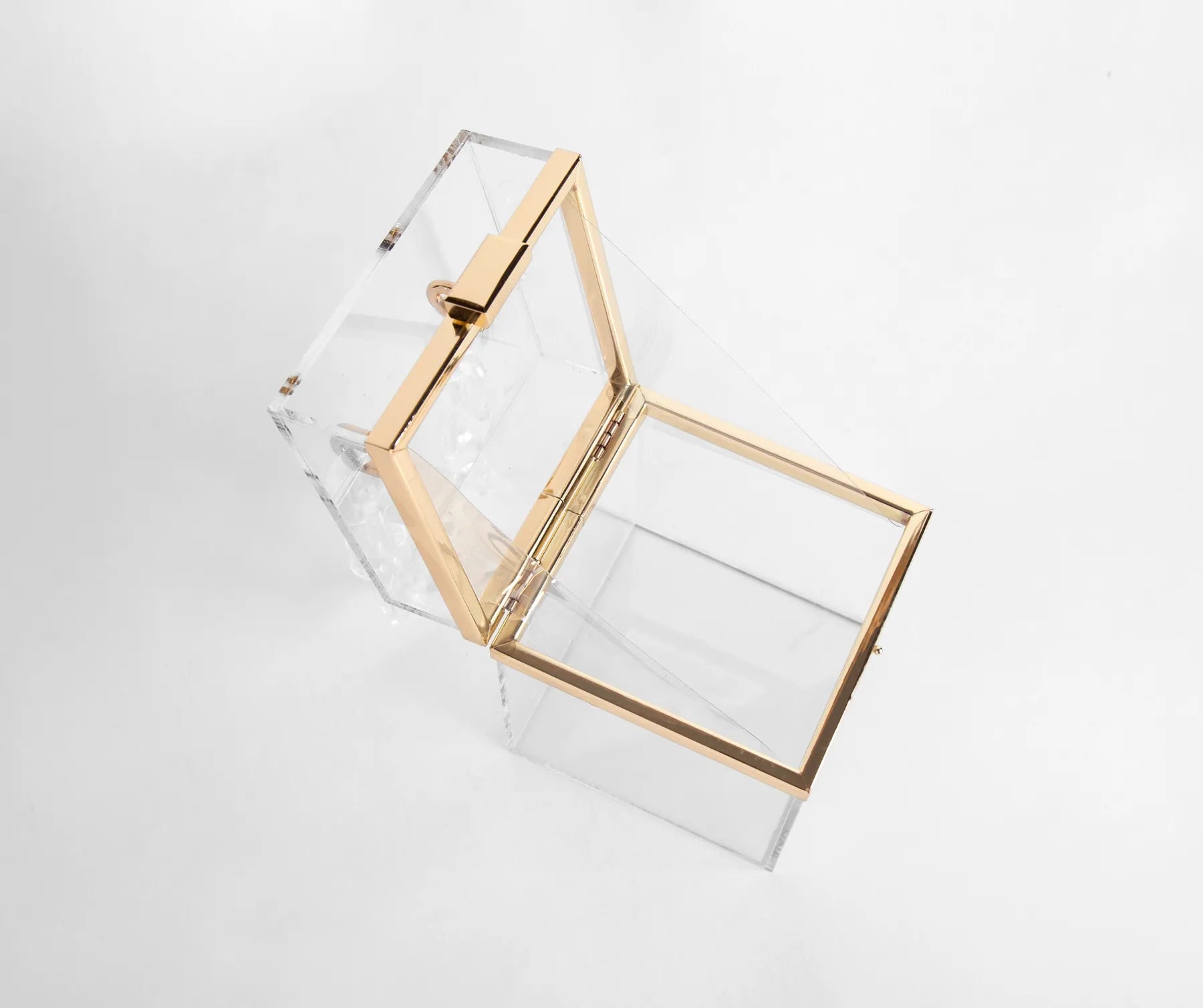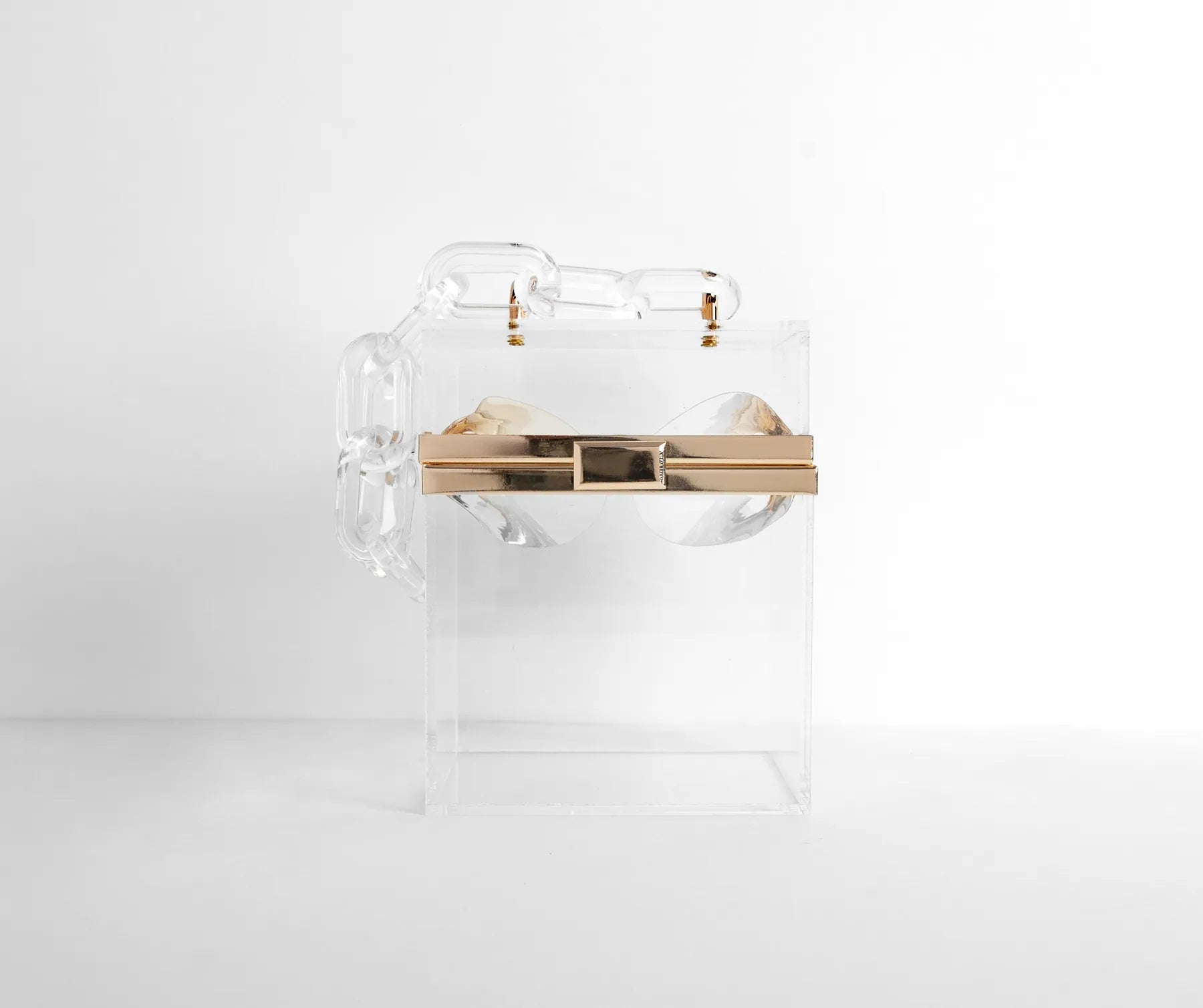 This structured box purse is so adorable! With a cube shape. its totally clear with a gold trim and a snap closure. Purse has a clear chain link handle. Since its clear you can pair with almost anything!