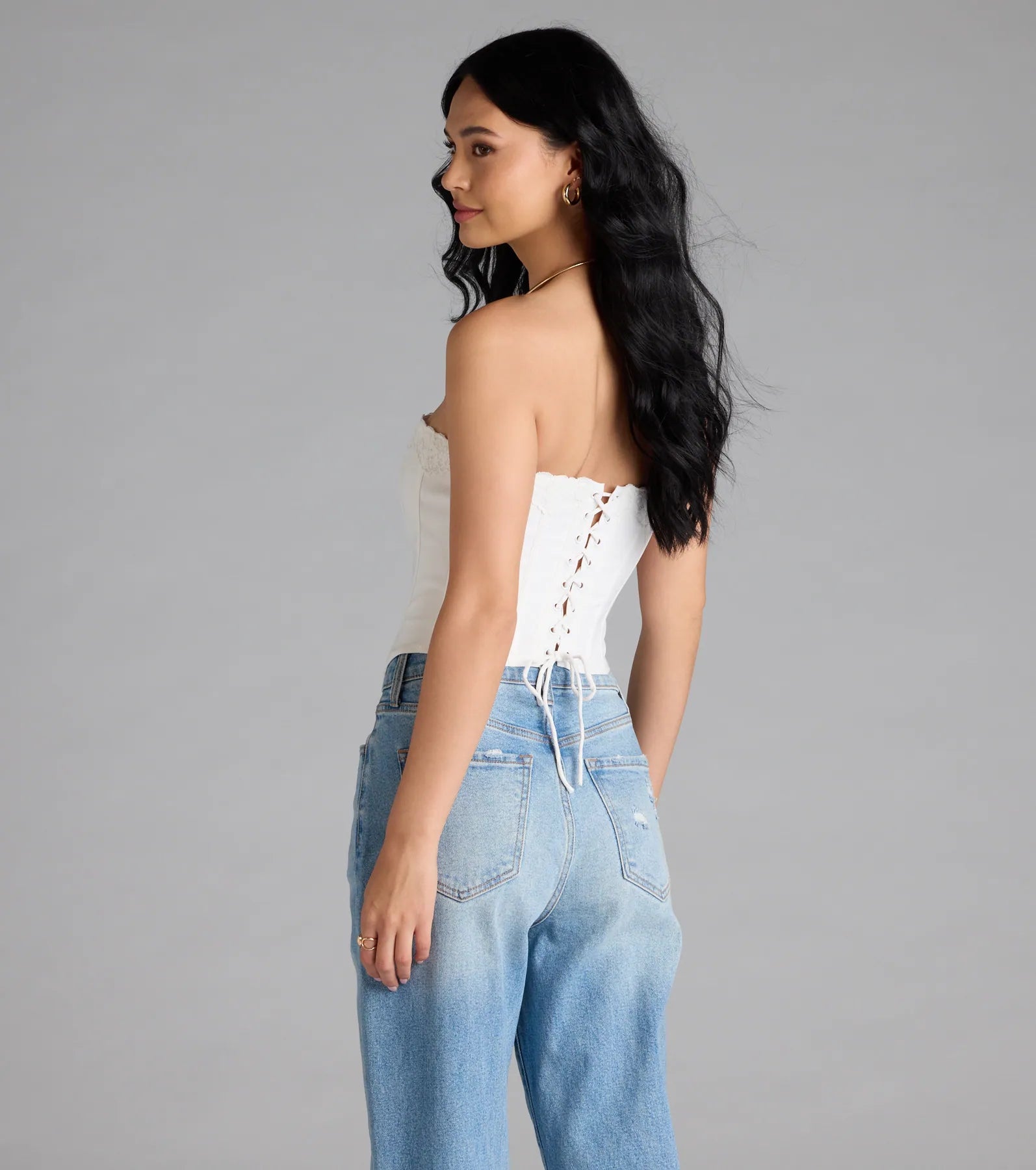 Chic and snatched will be your vibe in this woven corset designed with a dainty lace trim at the strapless neckline. It features front hook-eye closures and flexible boning for structure. a lace-up back for a customized fit. and an angled cropped hem perfect for pairing with high-rise bottoms.