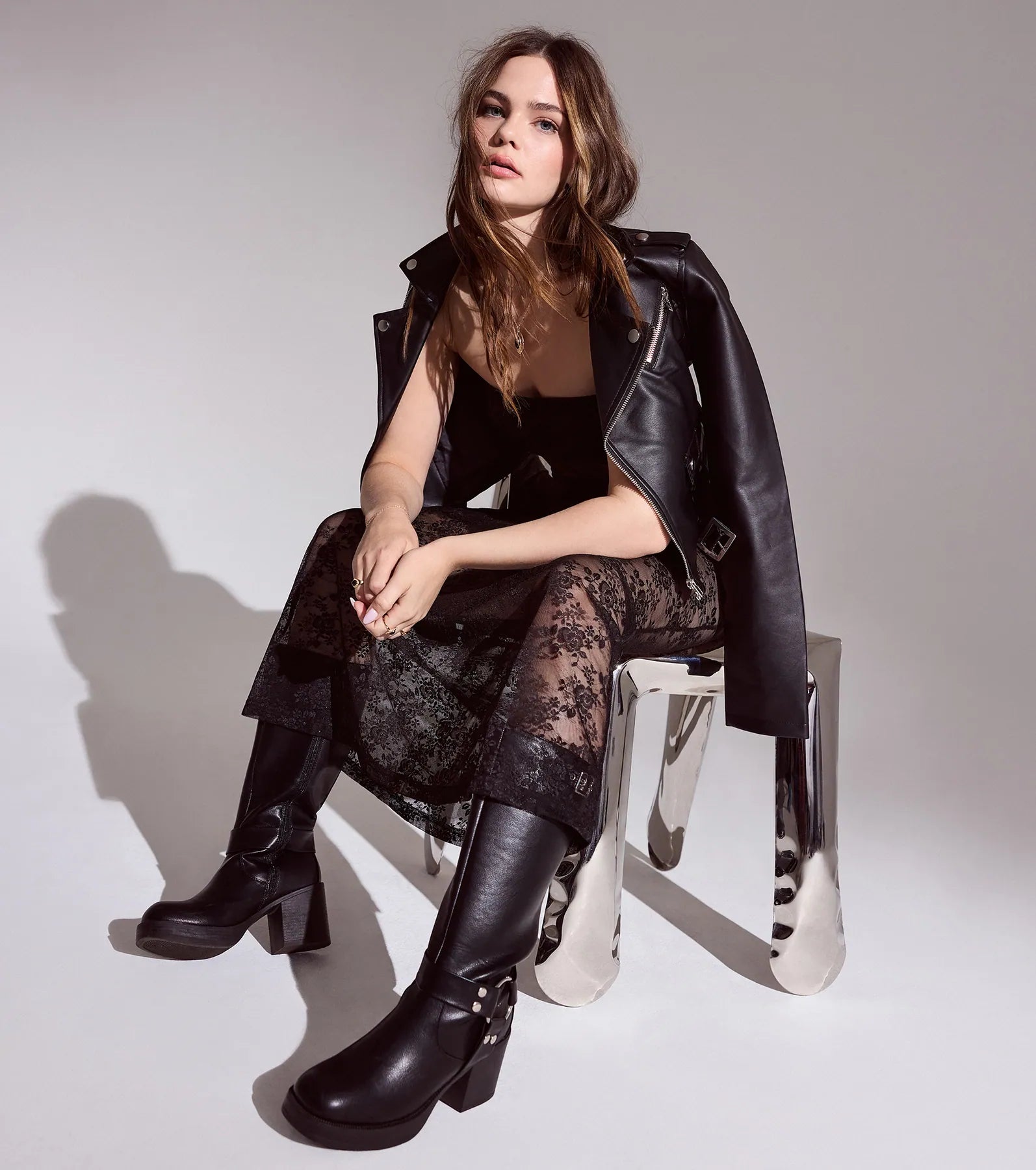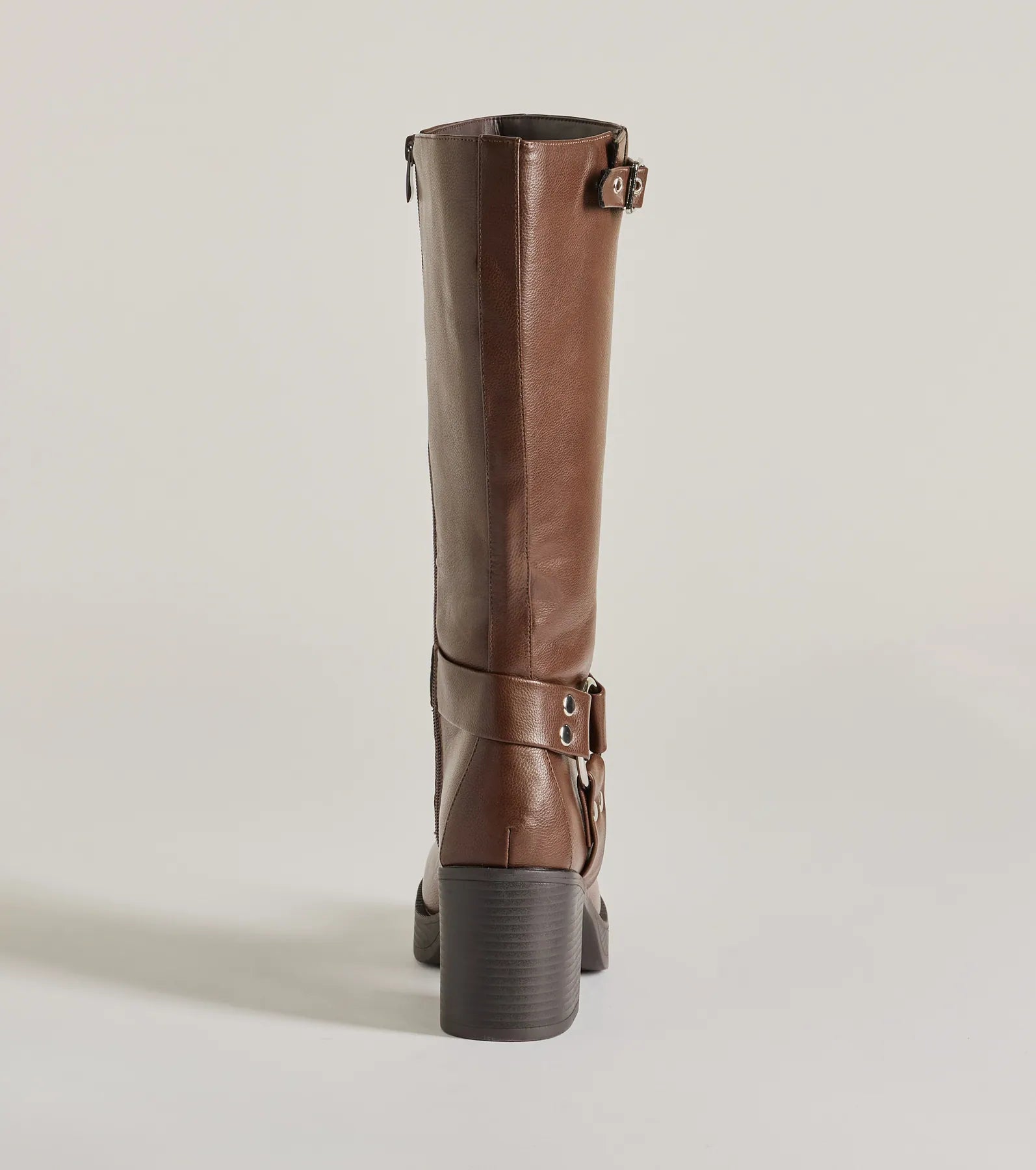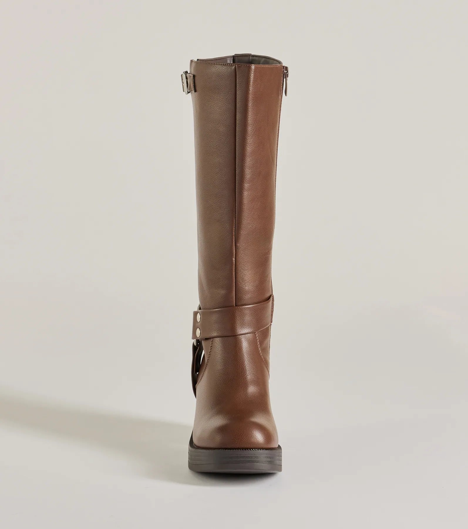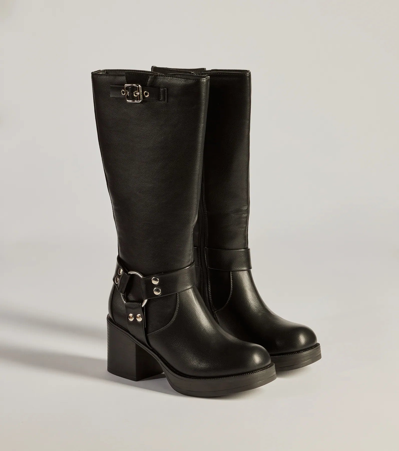 Add some chic edge to your fave ‘fits with these under-the-knee faux leather boots featuring a round toe. a dual buckle strap design. an inner zipper closure for effortless styling. a platform sole. and a sturdy block heel. Complete your looks with a trendy ring set.