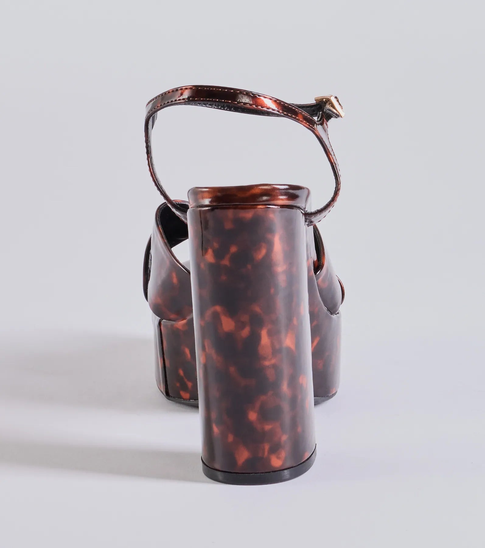 Make a chic impression with platform heels that elevate your look! The heels feature a trendy tortoise pattern. an open almond toe. knot accent. an adjustable ankle strap with buckle closure. and a sturdy block heel. Complete look with a midi skirt and long sleeve blouse.?