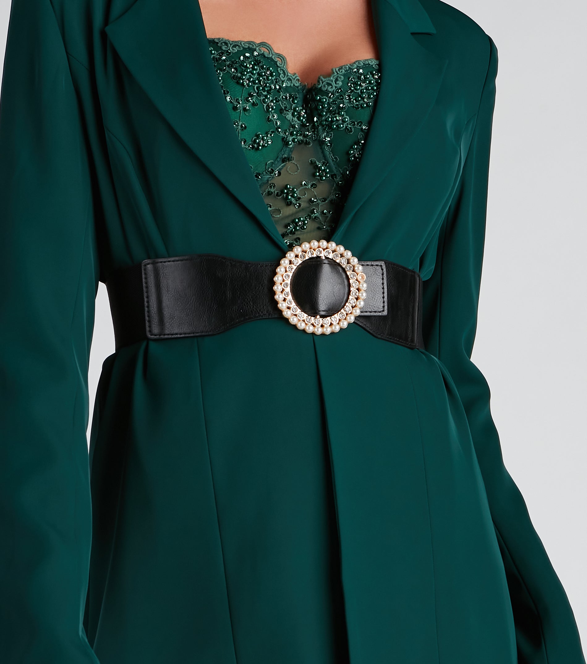 Give off a chic sparkle with this trendy embellished statement belt. It features a faux leather front. a center O-ring buckle with rhinestone and faux pearl embellishments. and a stretchy elastic back. Style over an with knee-high boots.