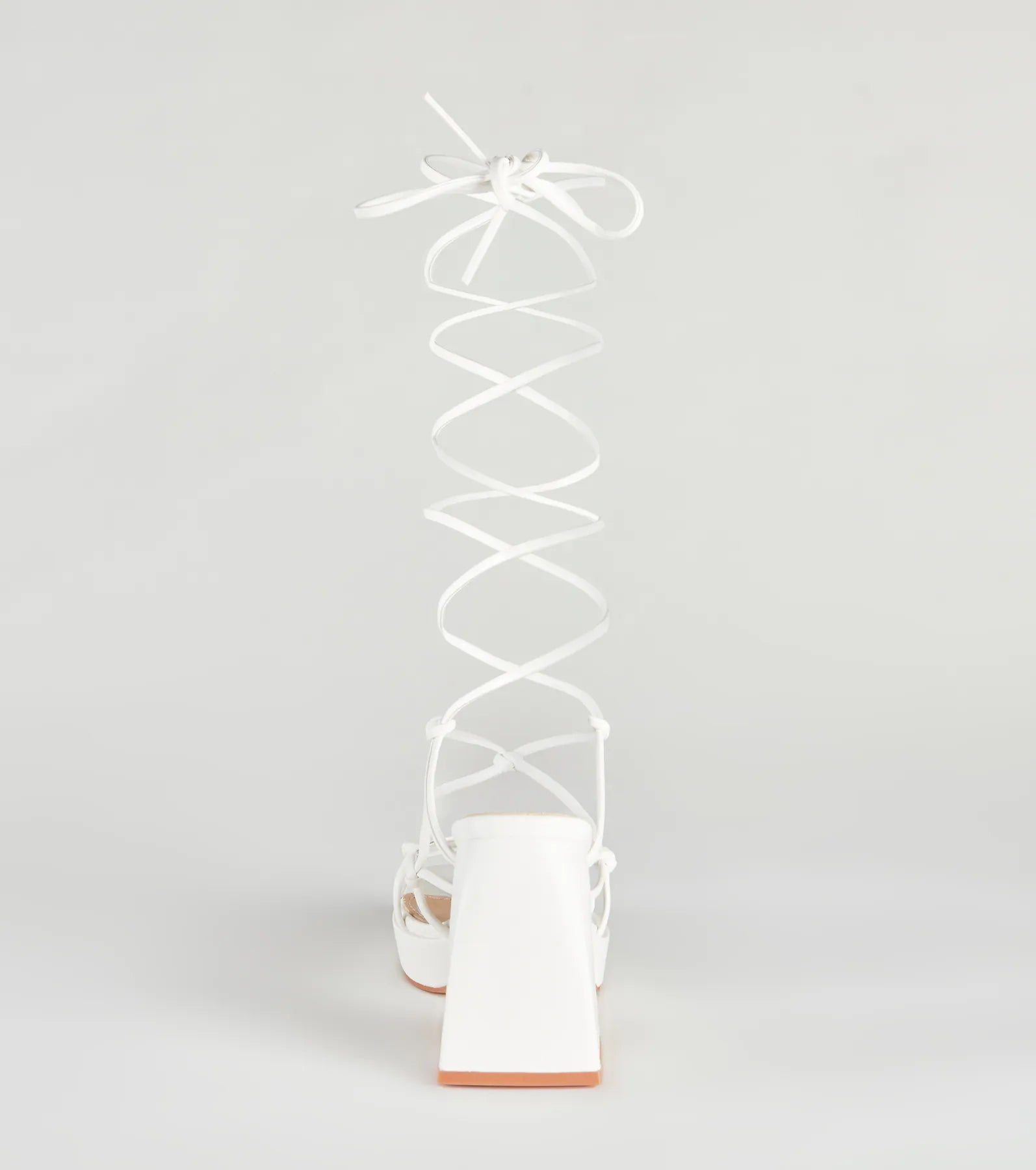 Showcase a chic strut in these cool-girl platform block heels. They feature an open square-shaped toe. a thin strappy design with knotted accents. lace-up straps that wrap around the leg. a platform sole. and a chunky block heel. Style with a .