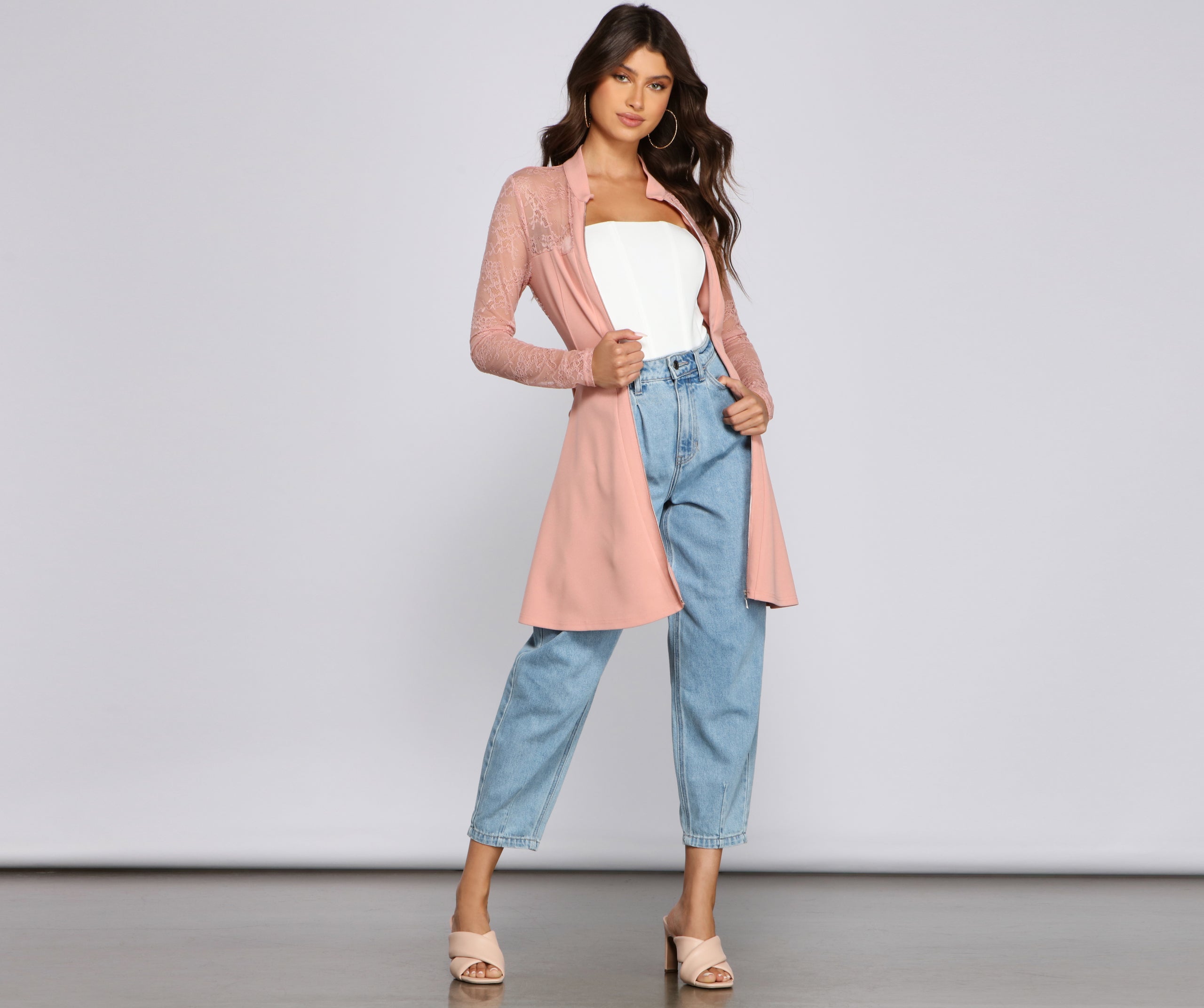 Give your everyday look a chic upgrade with this stylish trench dress. It features a mock neckline. long fitted sheer lace sleeves and a sheer lace back. a complete zip front. a tie-front belt. and a flirty fit and flare silhouette. Wear this trench as a dress. or layer over a and denim and complete the look with heels.