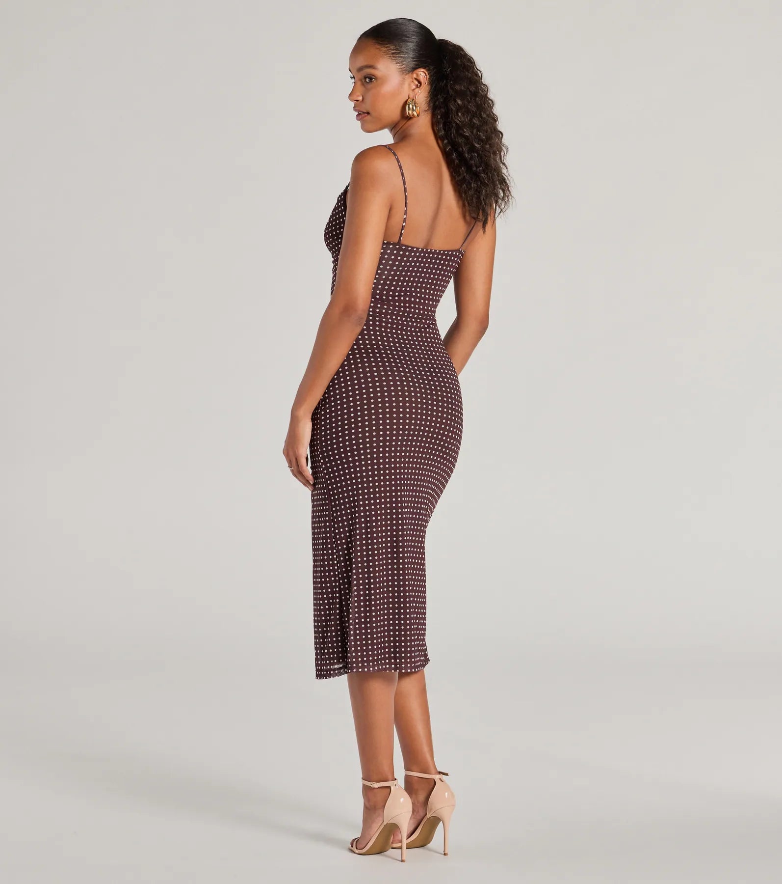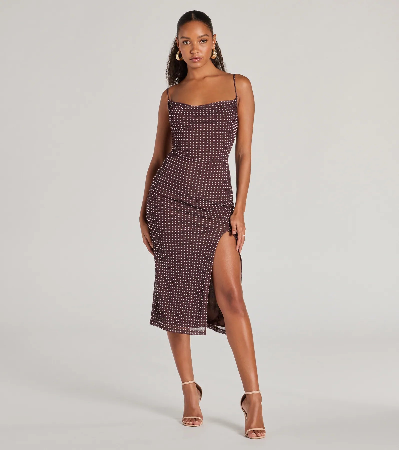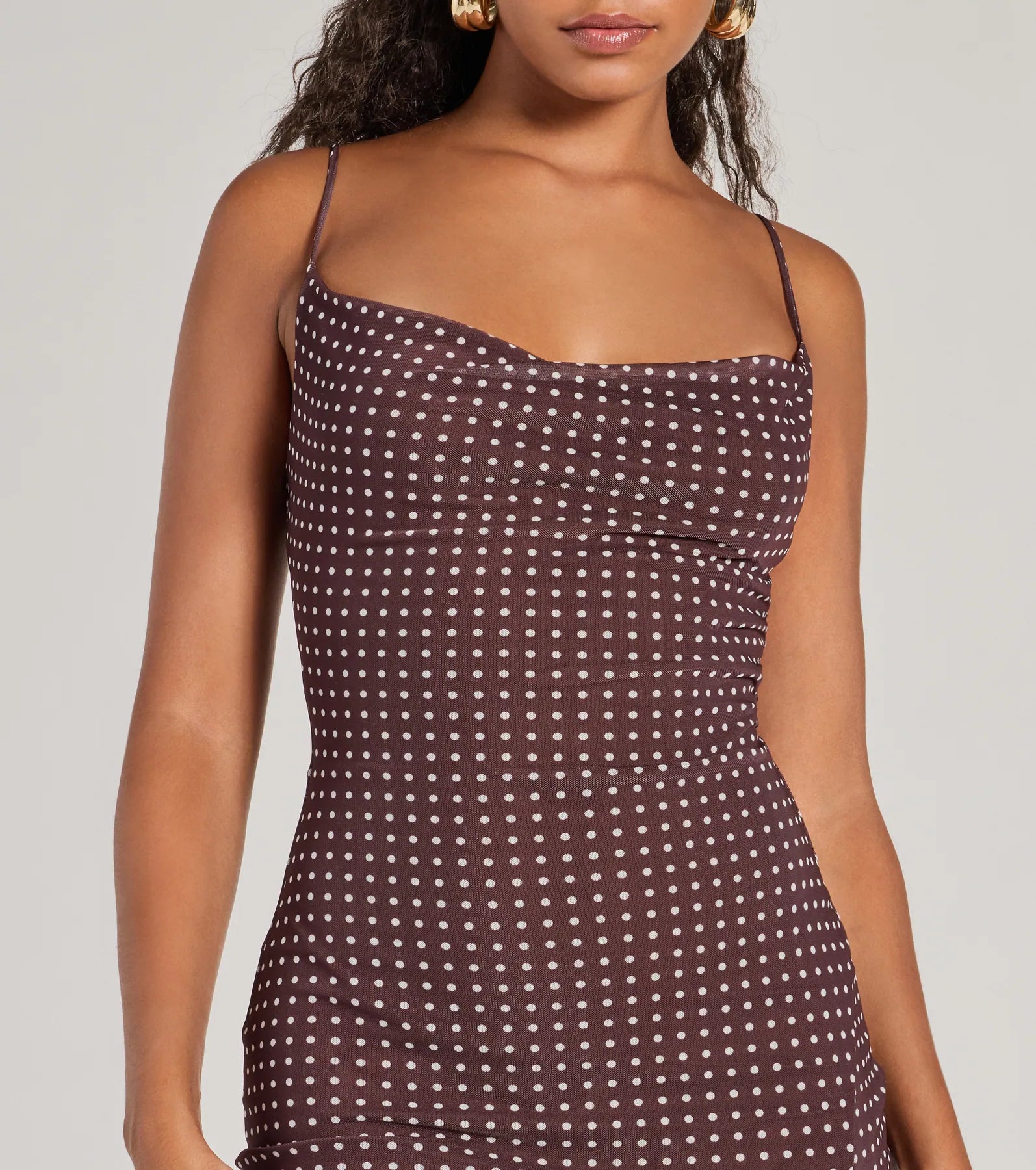 A sleeveless polka dot midi dress features a flattering cowl neckline. spaghetti straps. and a flowy silhouette with a front slit. Perfect for styling with stiletto heels for any occasion.