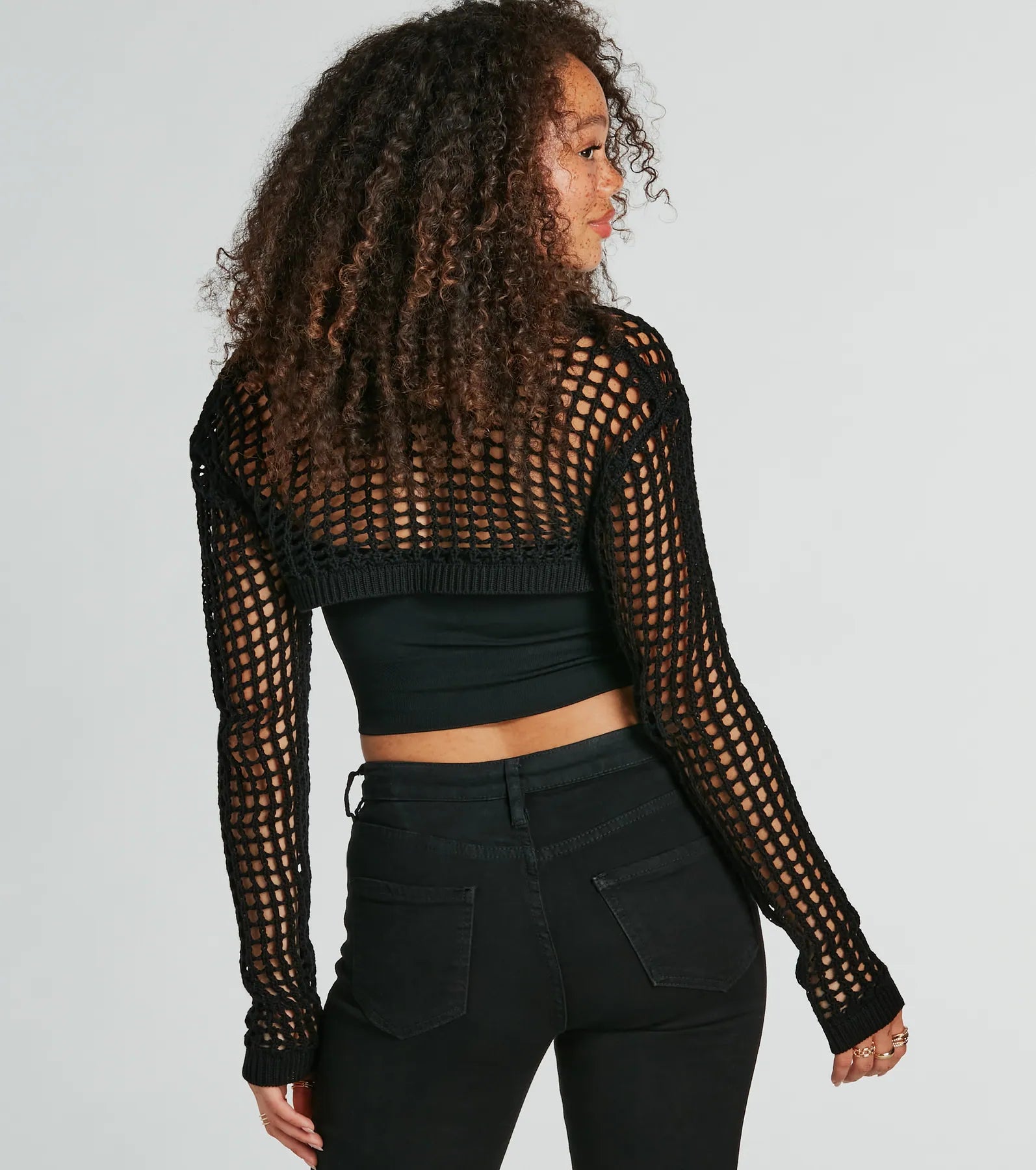 Style up this?sheer crochet knit bolero for a coastal chic vibe! It features long sleeves. an open front. and a majorly cropped hem. Wear this lightweight layer over with denim shorts.