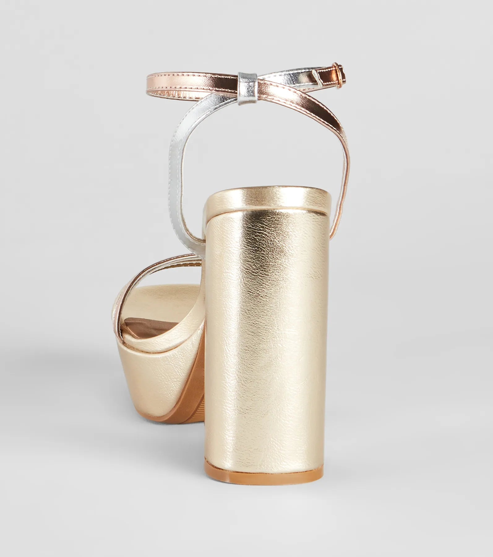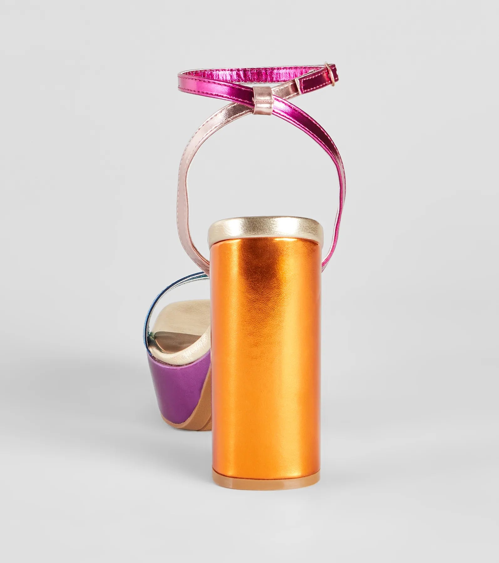 Have the most colorful steps in these metallic block heels for parties and celebrations! They feature a square toe. a three toe strap. platform sole. and an adjustable ankle strap with buckle closure. Complete the look with a