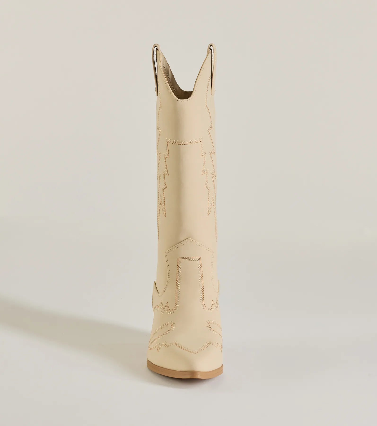 Step into your country girl era in these block heel western boots with an under-the-knee shaft and a sleek pointy toe. Pair with a cowboy hat for a festival or concert.