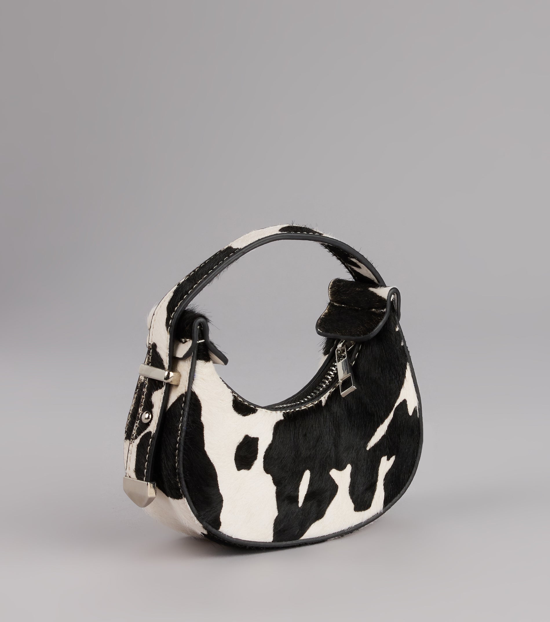 Western flair meets city cool. This cow-print pony hair mini purse brings bold texture and statement style in one petite package. Finished with sleek silver hardware and a curved handle. it’s the perfect piece to add a little yee-haw energy to your everyday looks.