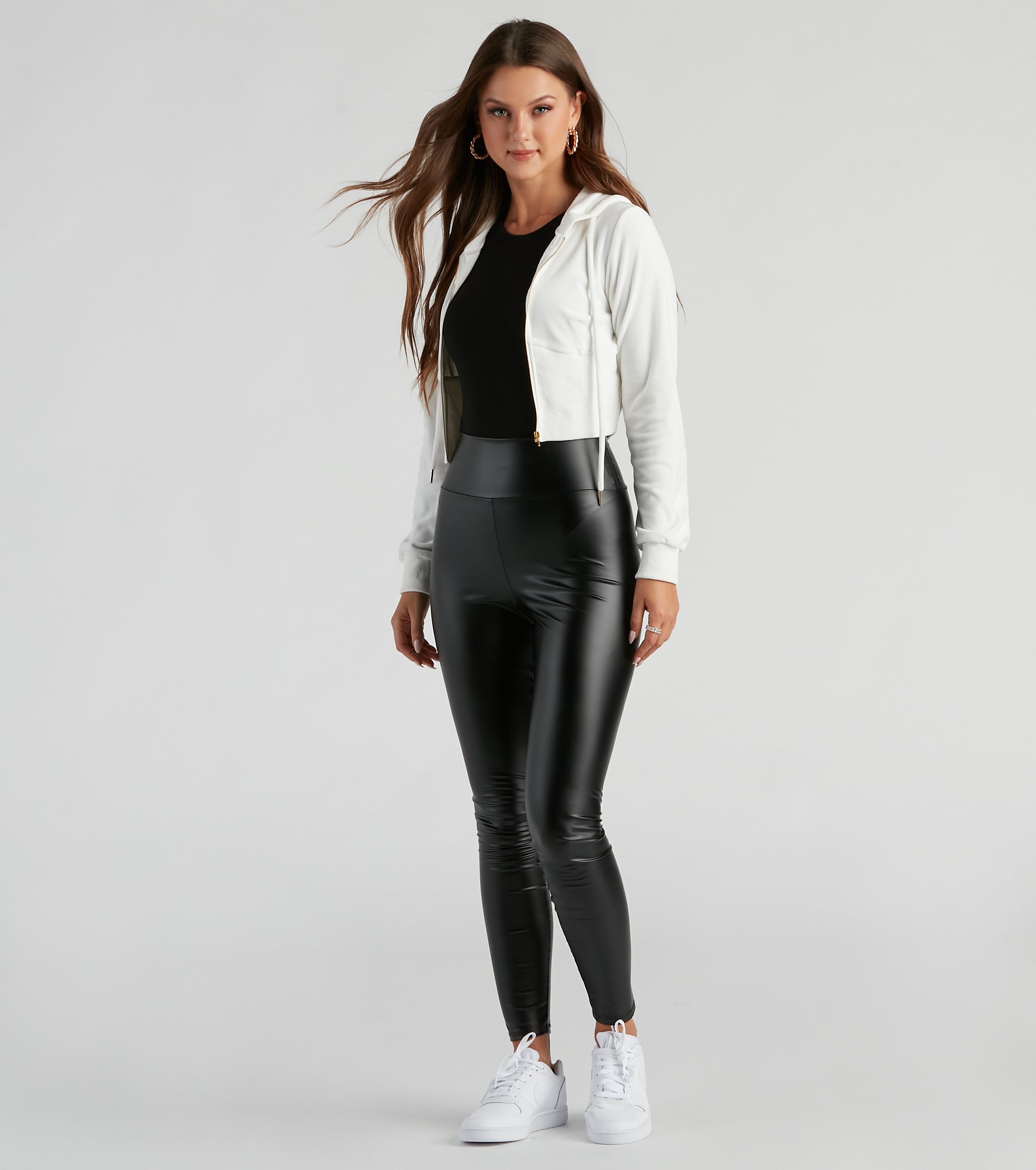 This adorable velour hoodie is the cozy basic you need in your life! It features a drawstring hood. a complete zip-front. long sleeves. a cute ribbed knit design at the waist. and a cropped. form-hugging fit. The hoodie is composed of a soft velour fabric that offers a moderate stretch. Style this hoodie with denim and .