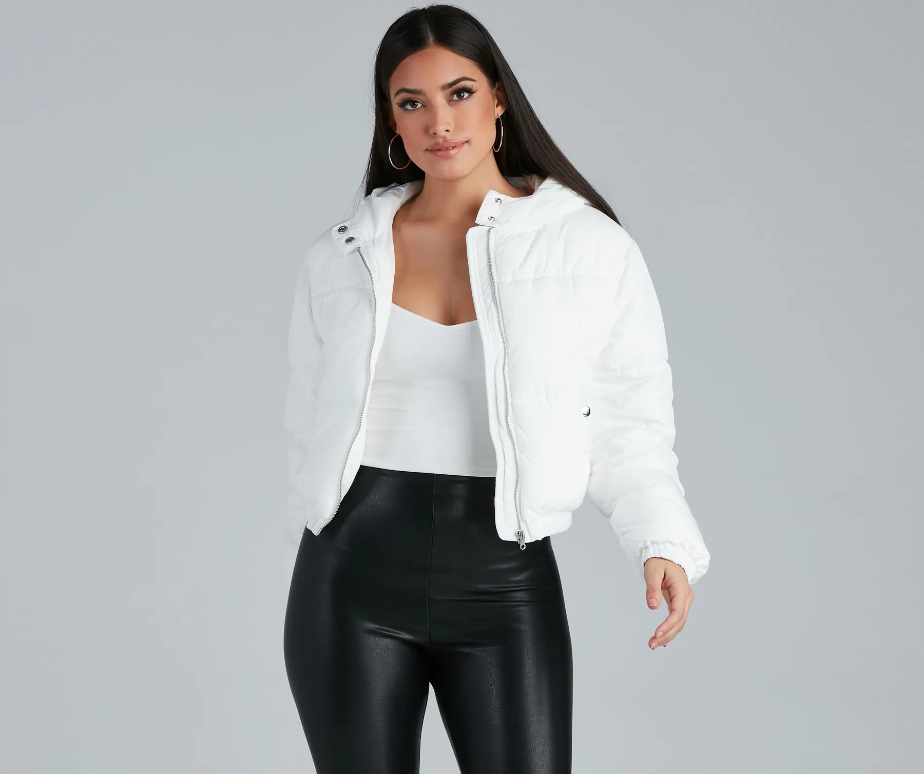 Layer on this adorable puffer jacket for a cute and cozy winter look! It features a hood. dual snap-button details at the neckline. a complete zip-front. long sleeves. and a relaxed. comfortable fit. Pair this trendy jacket with a .