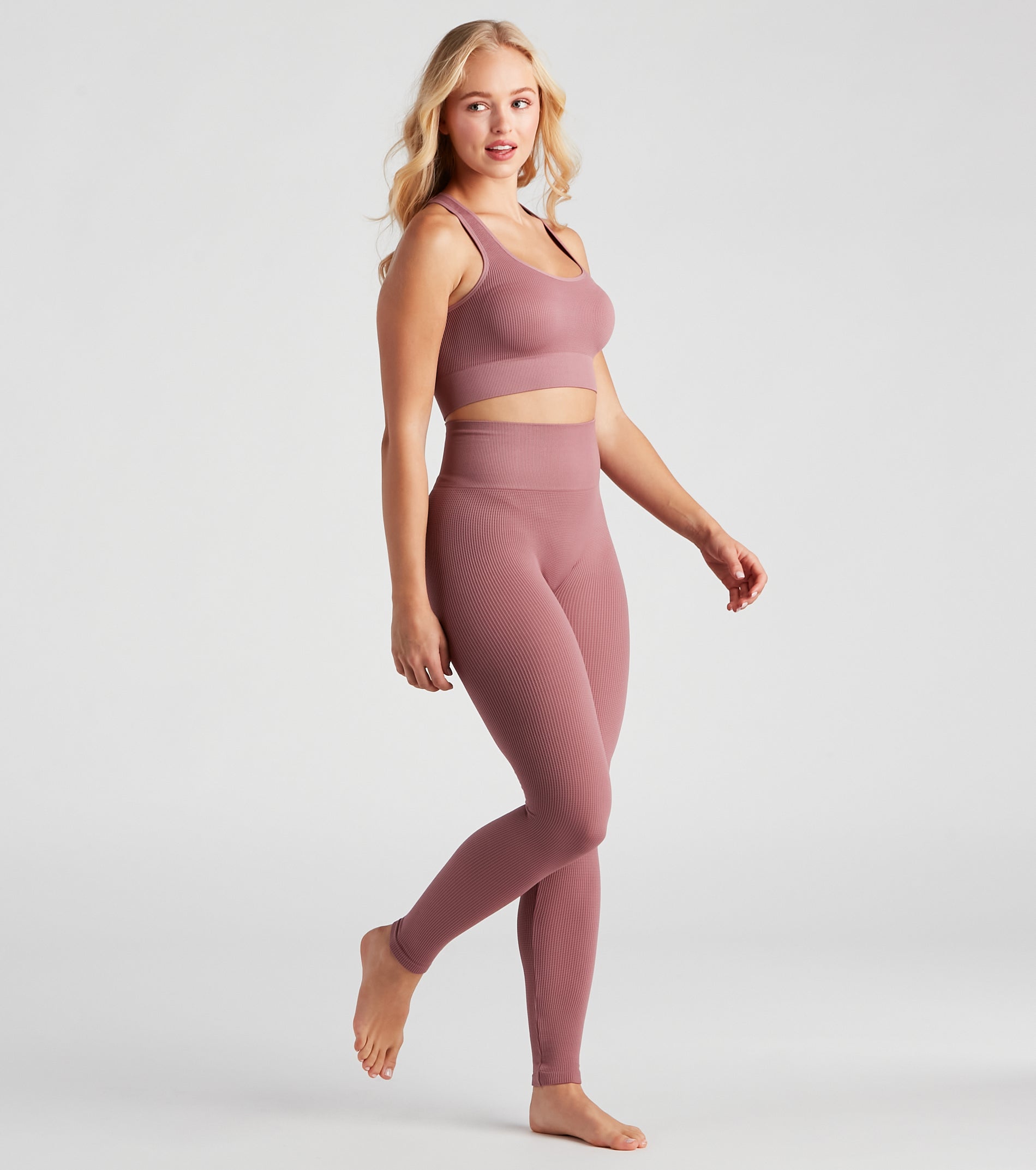 Cozy up for a movie night in this cute pajama top and leggings set! The sleeveless top features a scoop neckline with a racerback design and a fitted cropped hem. The matching leggings feature a high-rise waist with a form-hugging fit throughout the leg. The stretchy knit fabric has a?chic seamless look. Style this set with a .