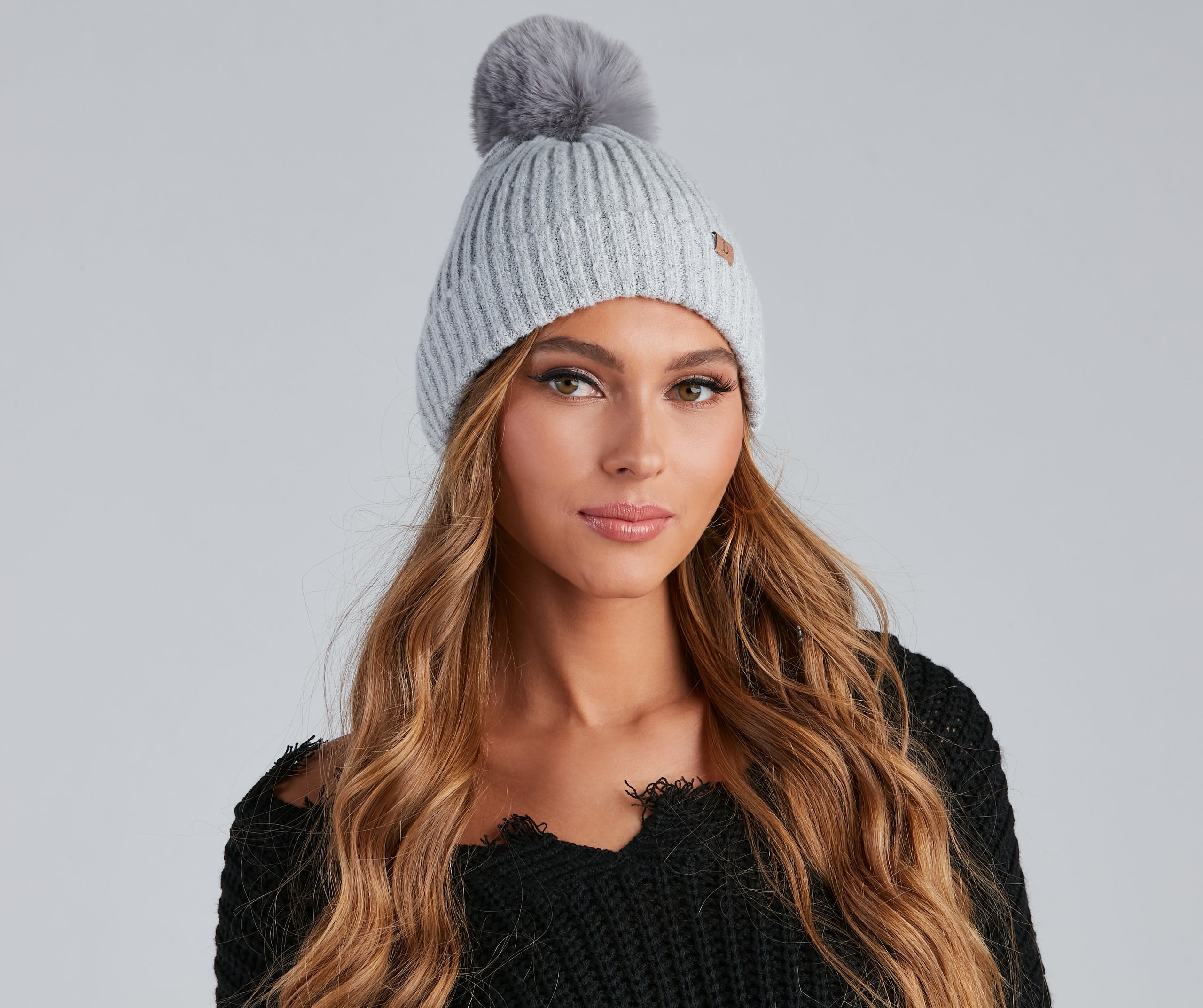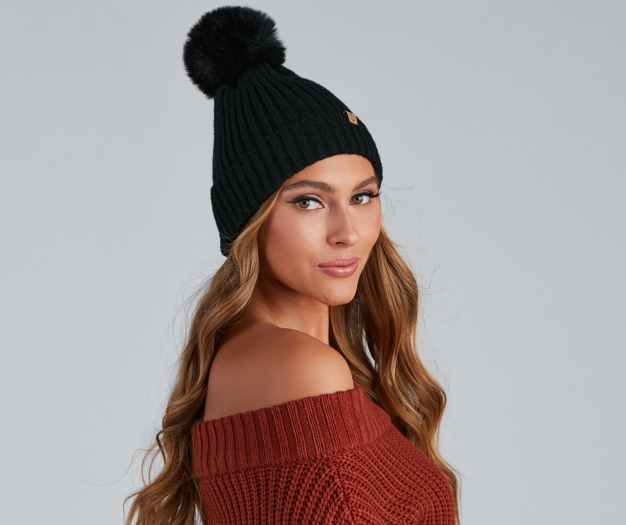 Cozy up with this adorable knit beanie! It features a ribbed knit material with a fold-over design and a faux fur pom accent. Style this cute beanie with .