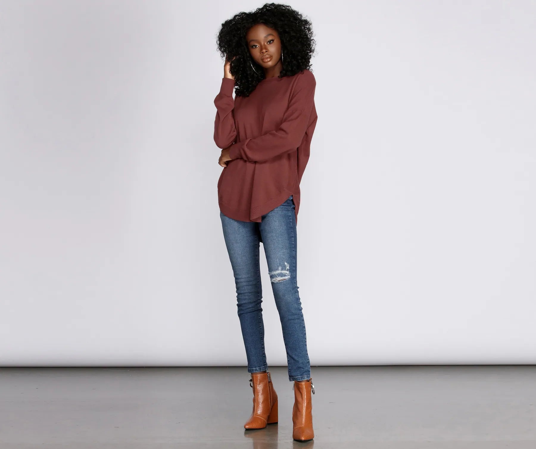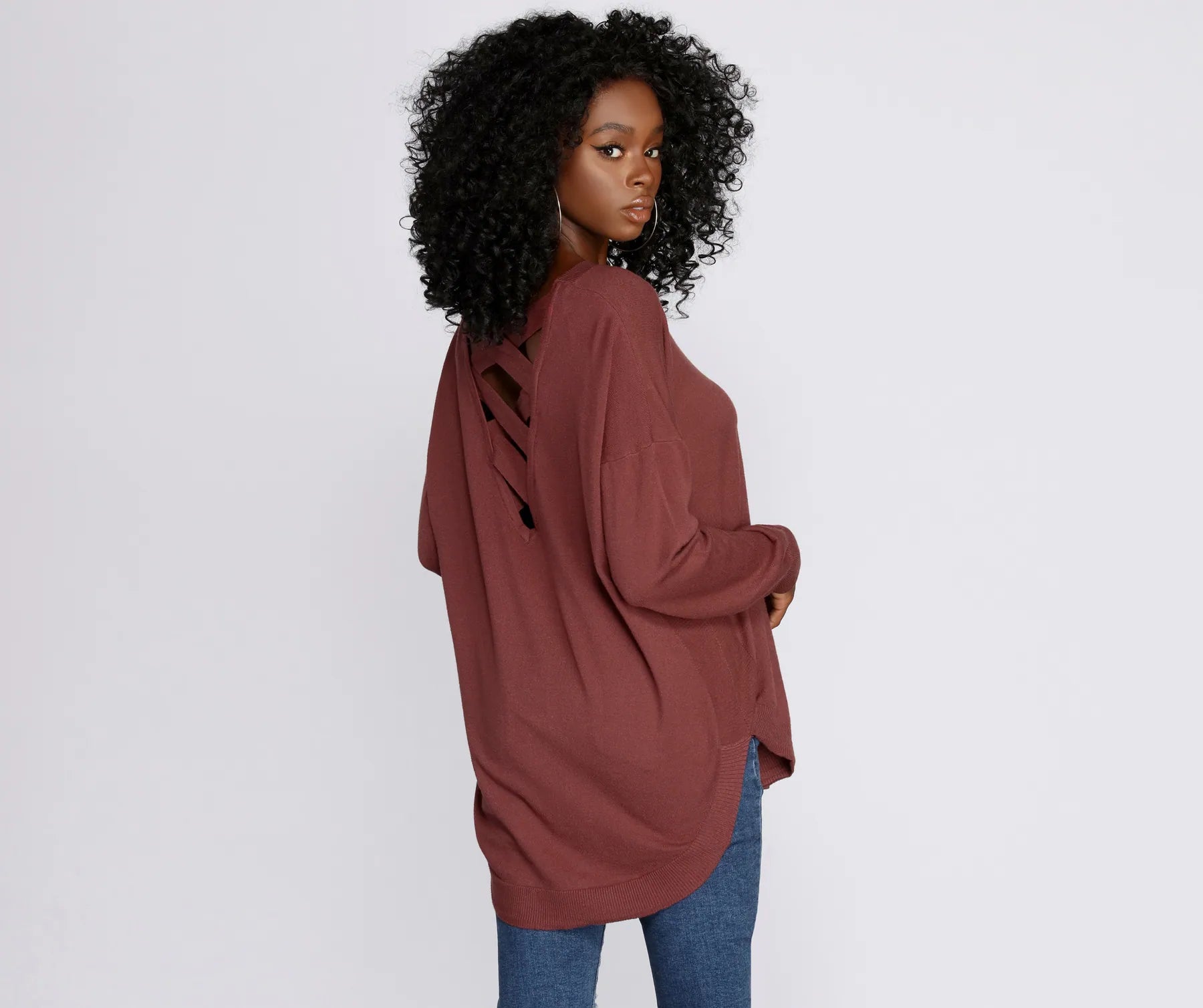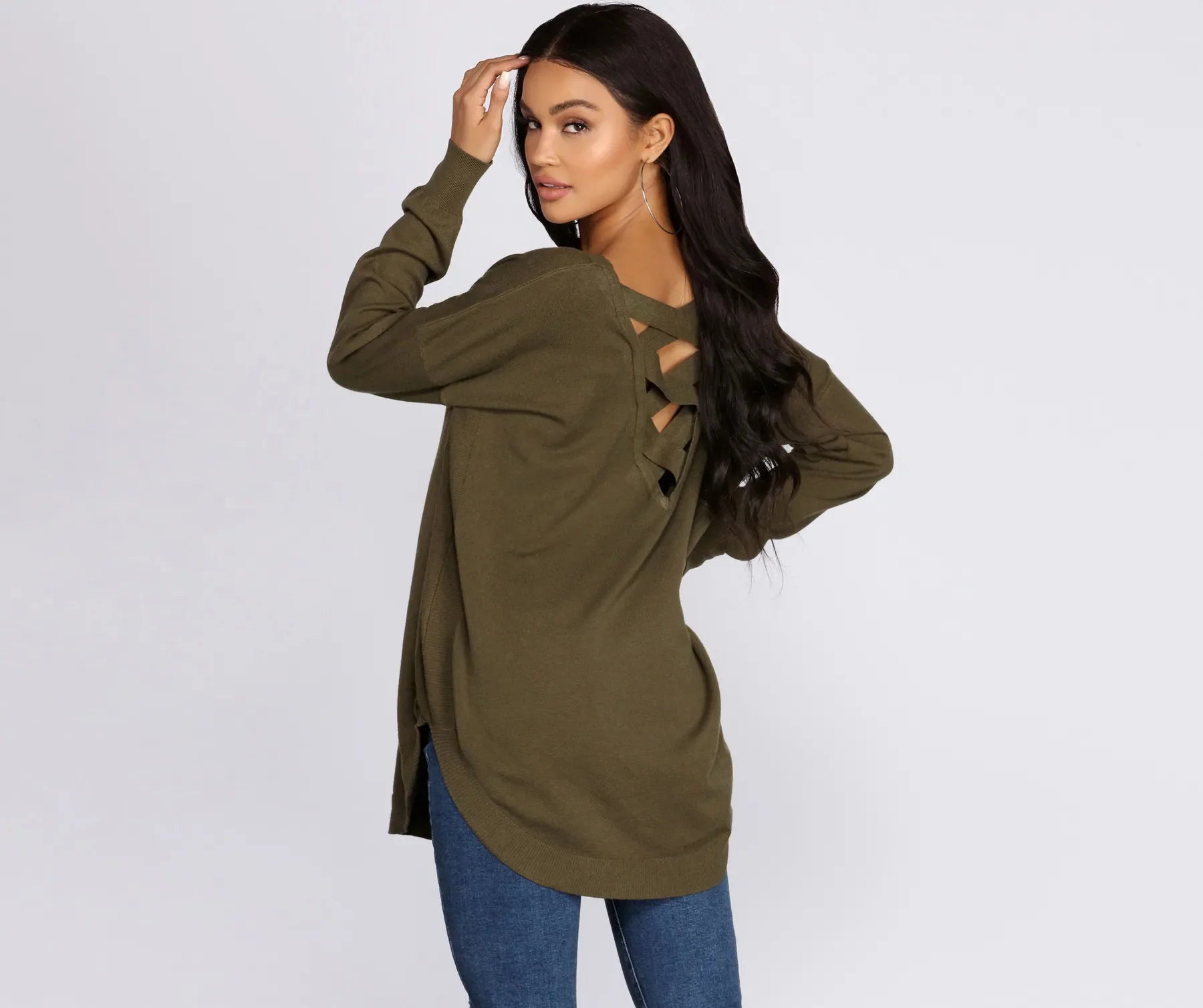 Fall back on this cute basic to layer with your fall staples this season! It features a ribbed crew neck. long sleeves. lattice straps to accent the back and a rounded hem. Tunic is composed of a soft to the touch sweater knit fabric that offers a relaxed fit with plenty of stretch.