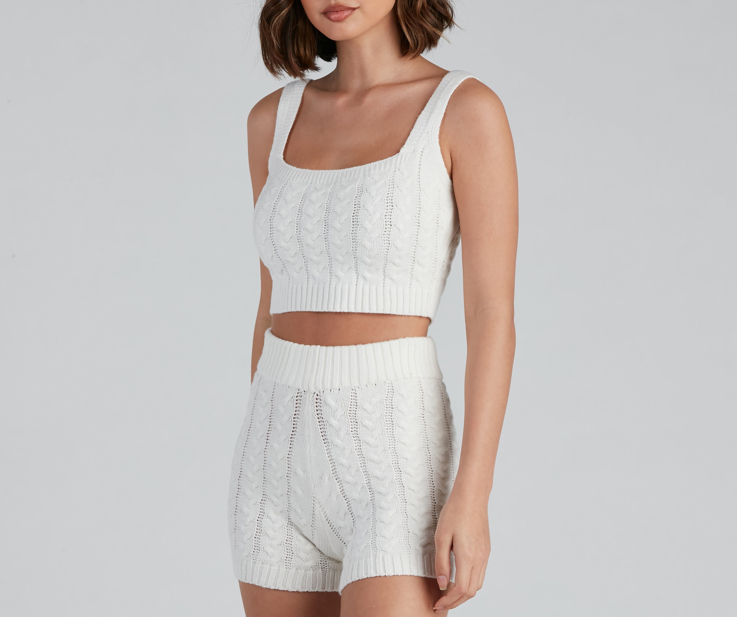 Cuddle up in this absolutely adorable pajama tank! It features a sleeveless square neckline. tank shoulder straps. a cable knit design. and a cropped. form-hugging fit. Complete your cozy look with the matching pajama shorts.