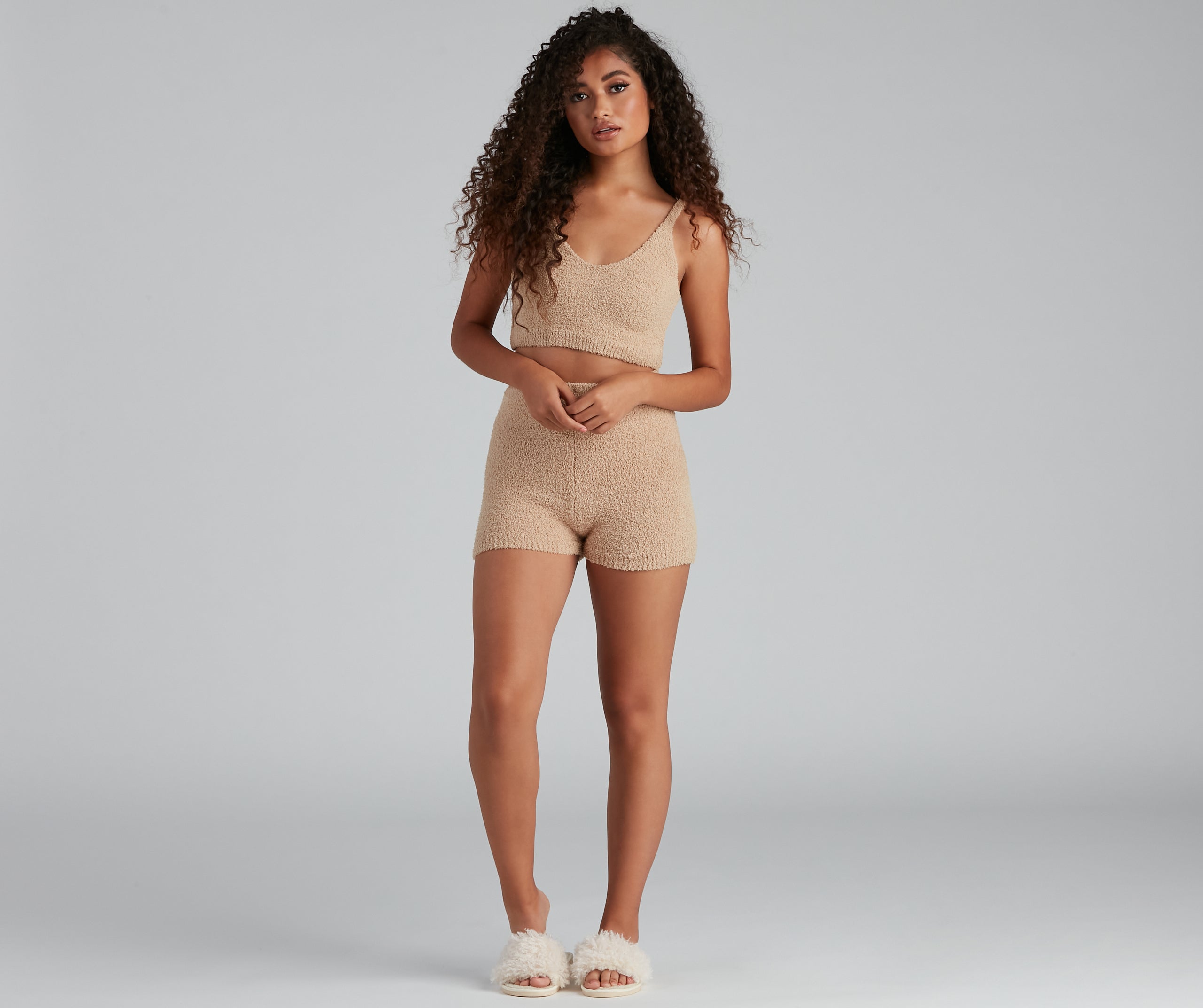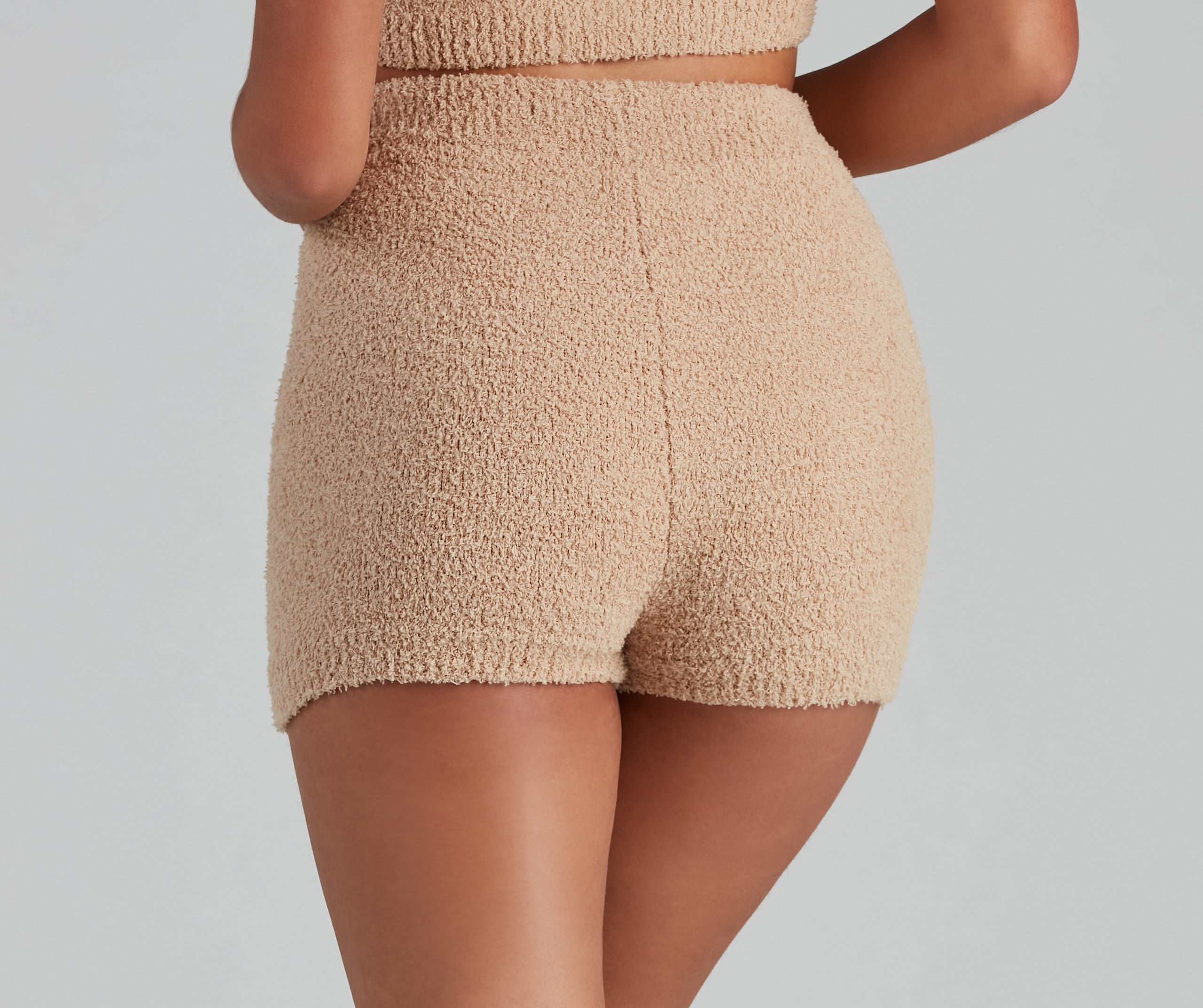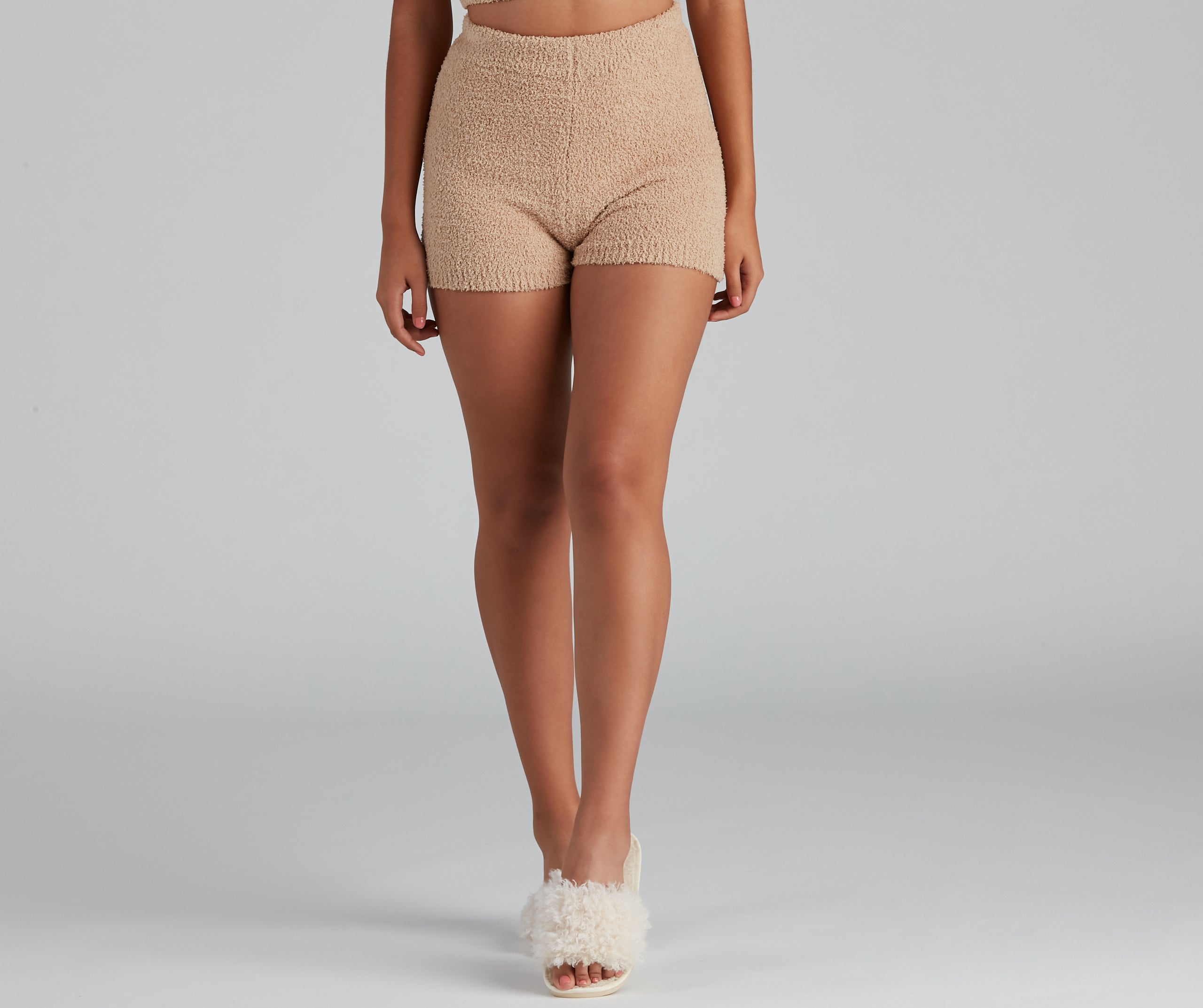 Cuddle up in these ultra-soft chenille knit pajama shorts! They feature a high-rise waist. a form-hugging fit. and offer plenty of stretch for comfortable wear. Pair these shorts with the matching pajama tank and cozy slippers.