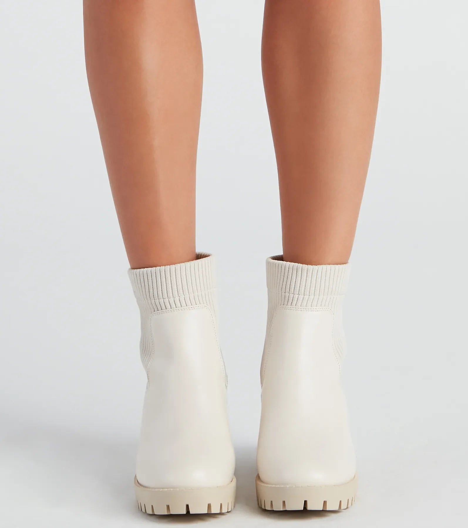 Hey. there cutie rocking these lug sole booties! They feature a round toe. chunky block heel. and rib-knit upper design on faux leather material. Complete the look in a flannel for cold-weather vibes.