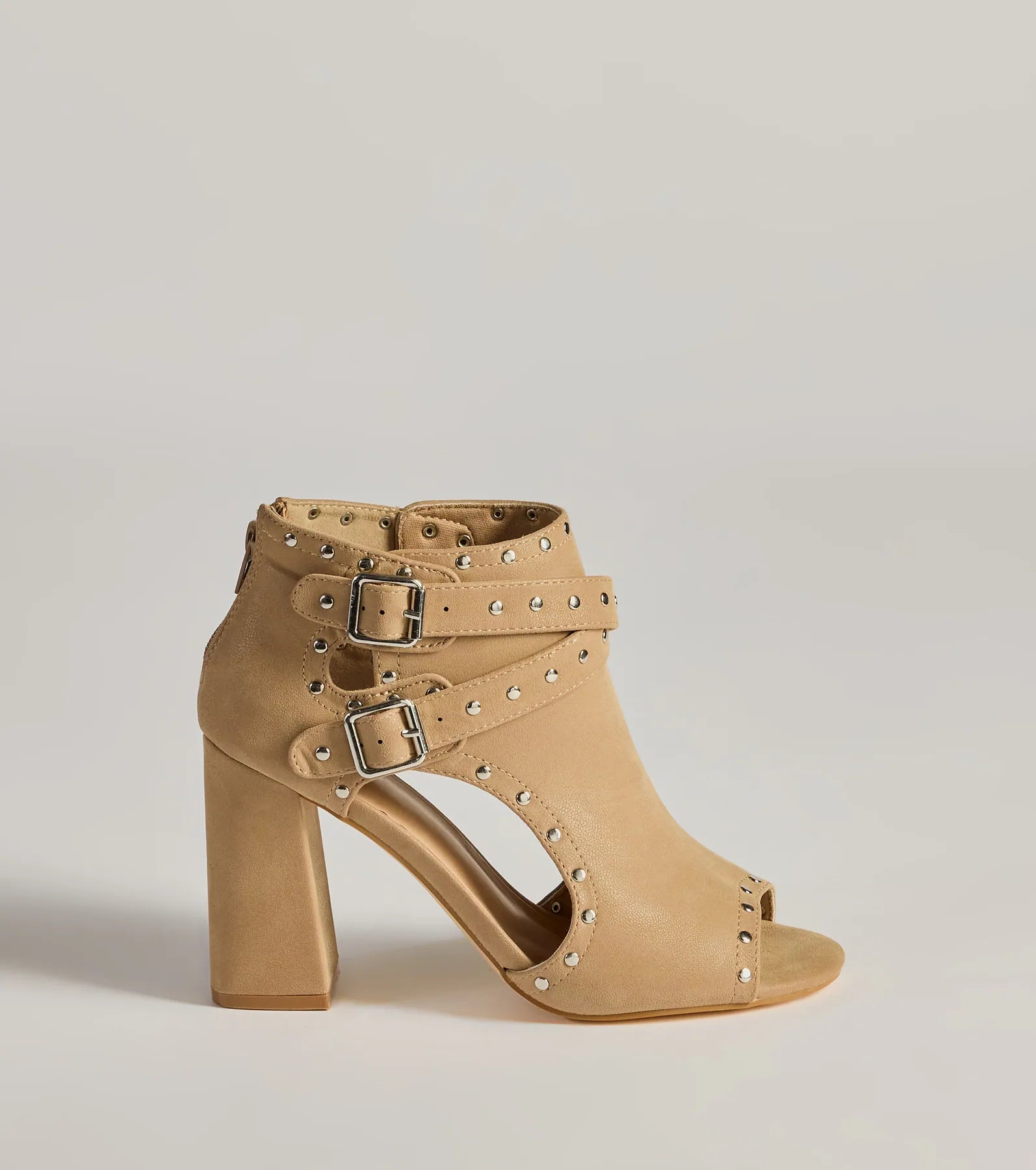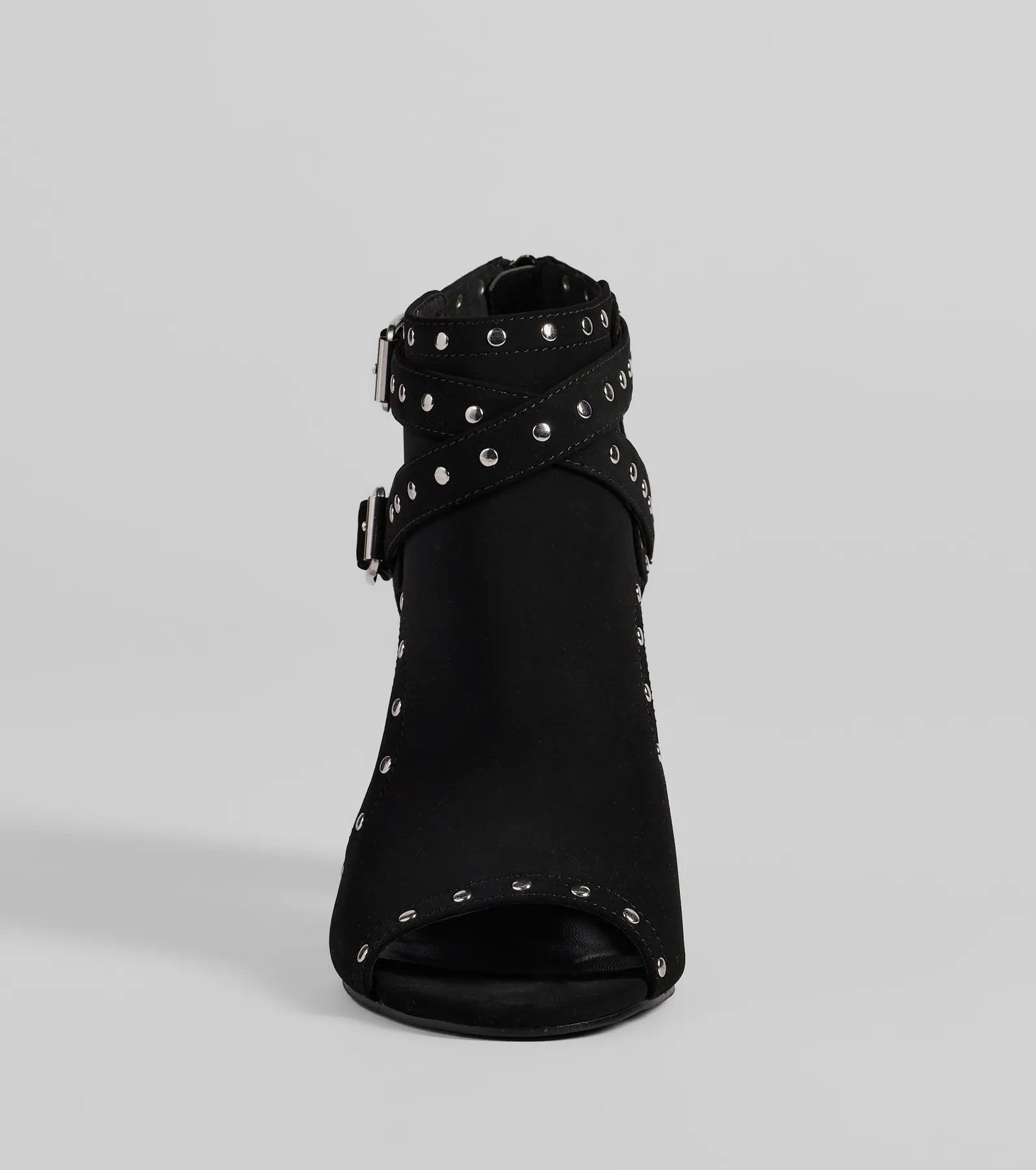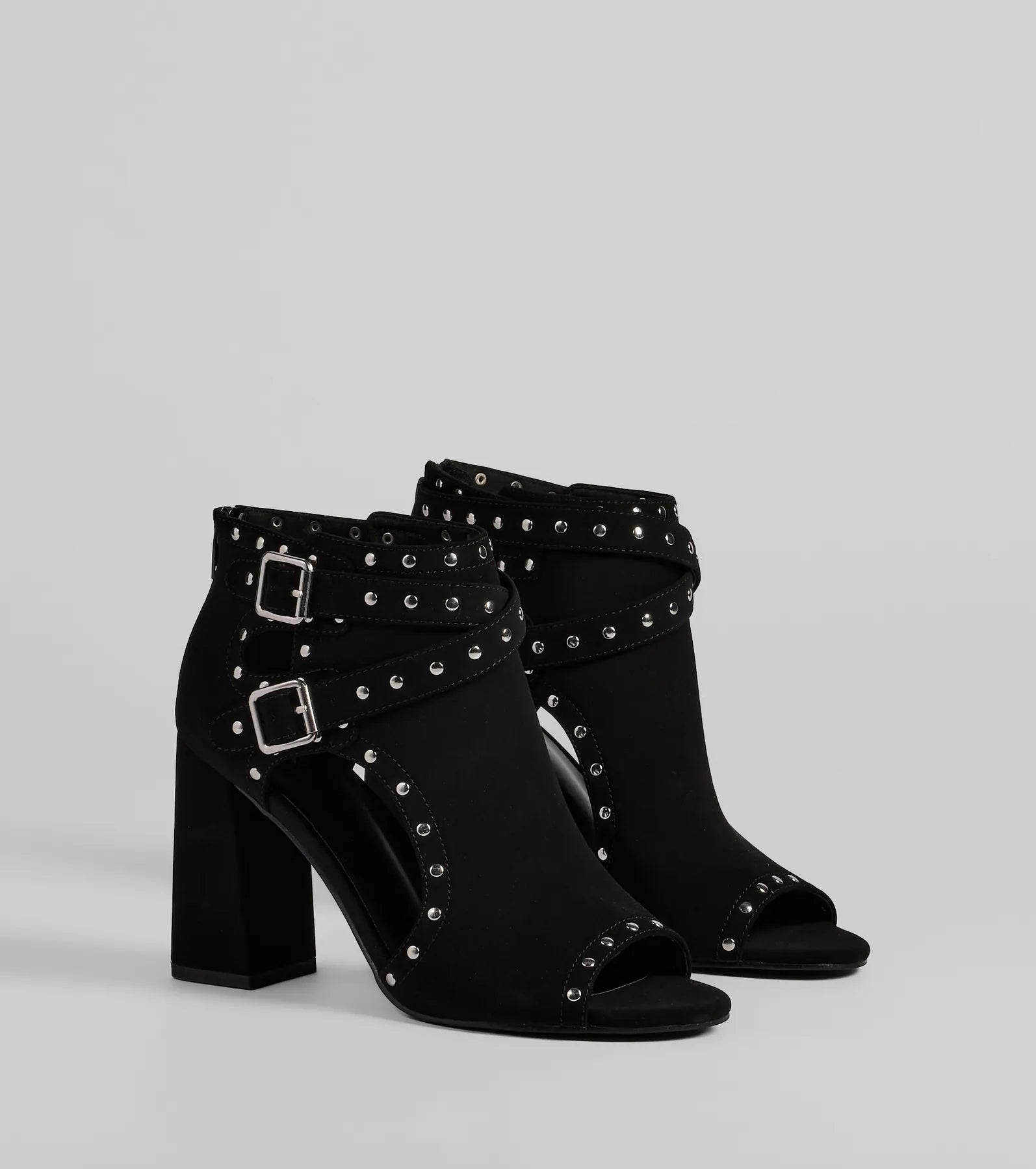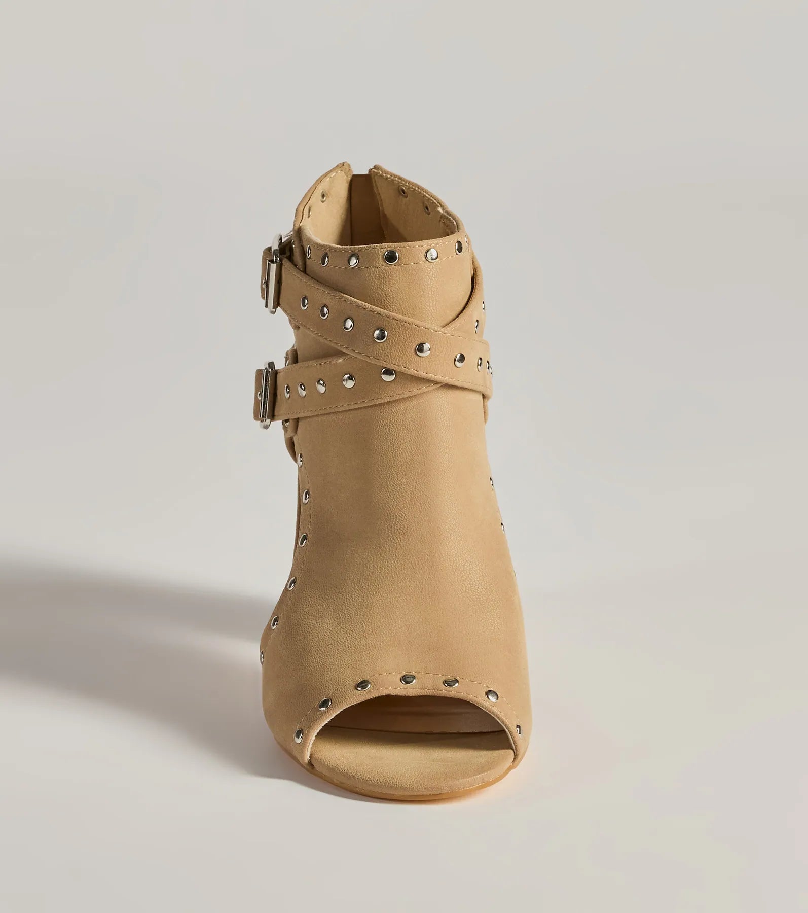 Make a bold statement with the daring details studded ankle booties. Featuring a block heel. peep toe. and criss-cross straps with metal buckles. these booties are your new go-to for standout style.