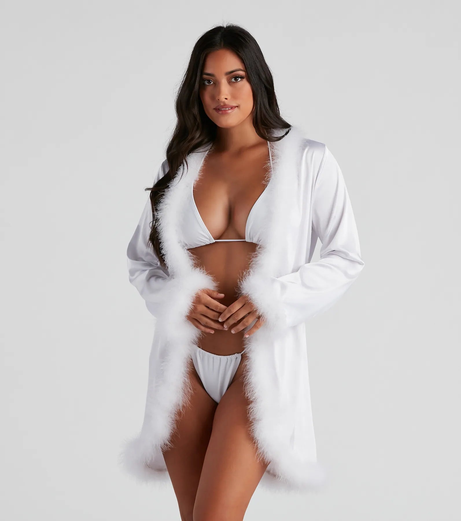 Steal his heart in this dreamy satin robe for a sultry night in! It features long sleeves. an open front with belted waist tie. and a marabou feather trim throughout. Complete the look in a sexy set.